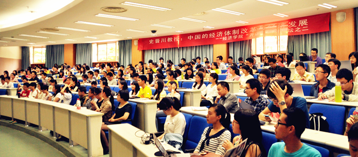 讲座开始,史教授以严谨但不失风趣的话语向我们娓娓道来。他用经济学的基本知识与自身的丰富经历,深入浅出的分析了我国经济改革的背景与新中国改革开放以来在经济上的巨大成就,但同时他中肯的指出,近几年来我国经济增长率减缓,随着刘易斯拐点的到来,未来的经济发展任务仍旧紧迫。中国需要全面的改革创新,特别是体制上的改革来获得新的经济增长点,预防跌入“中等收入陷阱”。史晋川教授还特别强调了中国经济体制改革的必要性以及政府在激励企业进行创新方面的重要性。