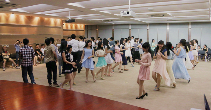 开场由学生交谊舞协会的同学们带来了一段热烈欢快的舞蹈,一曲点燃了大家的热情,也消减了陌生同学之间的距离和踌躇;在自由舞环节中,同学们迈开或熟练、或生疏的步伐,在“教练”们的带领下,翩翩起舞;在舞池的外围,新结识的同学们愉快的交谈着,聊聊经院的生活、聊聊光电的故事;而由特邀嘉宾宗文逸和唐嘉余带来的歌曲《眼色》、《如果没有你》和《温柔》,又将现场的气氛推向一个新的顶点,大家伙儿深深陶醉在深情唯美的歌声中,不由自主地随着音乐打起了节拍,忘情之处更是同声合唱;在游戏环节《我爱记歌词》中,同学们各显神通,经过两轮比拼,歌词达人将大奖拍立得收入囊中……