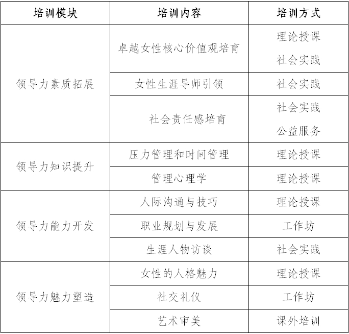 威尼斯144777欢迎您女大学生领导力提升培训班针对女大学生素质、知识、能力、魅力四个维度,坚持理论培训和实践成长相结合,将女大学生领导力培养主要划分为以下四个模块: