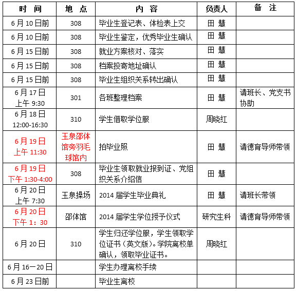 以上时间安排会根据学校的统一安排有所更新与调整,学院将及时通过班长通知各班毕业生,请同学们保持手机畅通,按照学校及学院统一安排顺利完成各项程序。