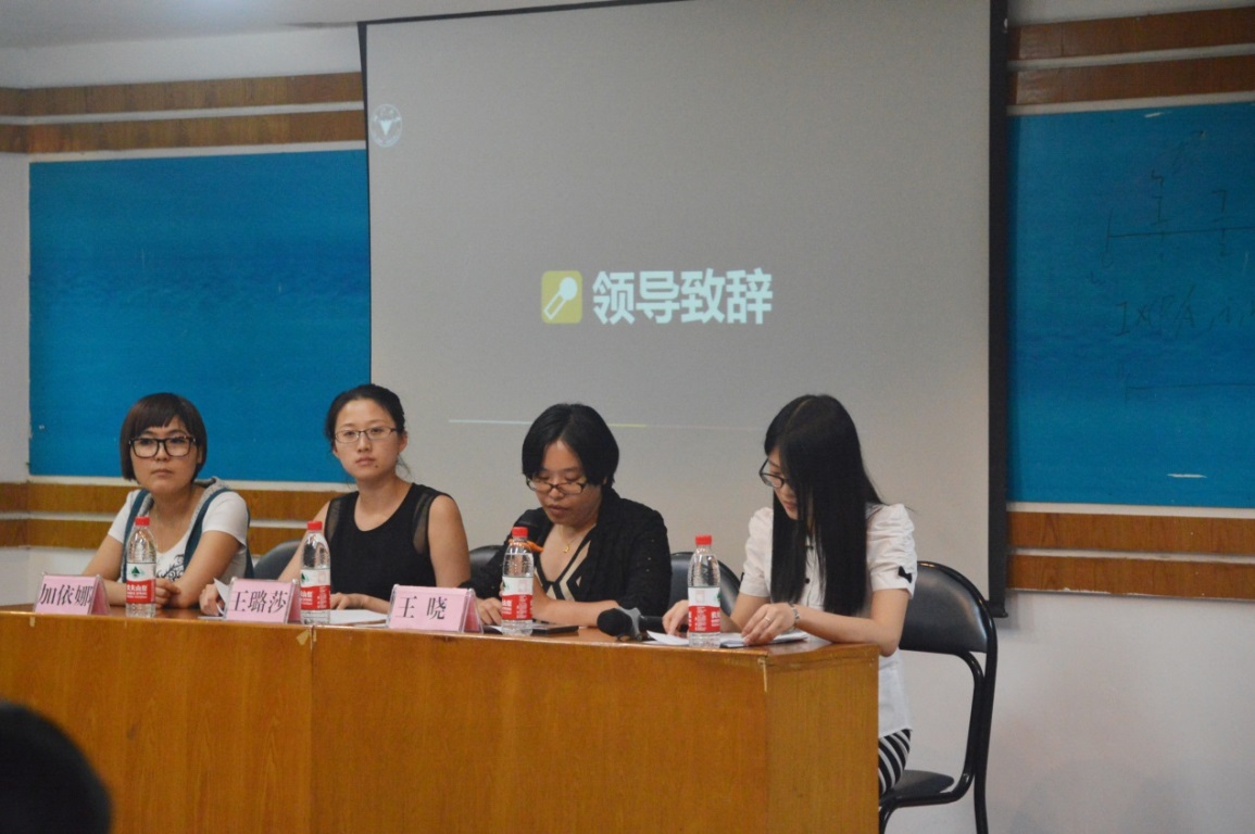 会议在庄严的国歌声中拉开了帷幕。王晓老师首先发表致辞,她总结了过去一年的工作情况并肯定了现任博会、研会和分团委的工作表现。接着,王老师对新一届三会主席团提出了三点要求:一、围绕学校、学院的中心工作,树立三会的工作品牌;二、围绕服务同学的目标,开展同学喜闻乐见、有助于同学成长成才的活动;三、建设三会良好形象,扩大三会在学院、学校以及外界的影响力。