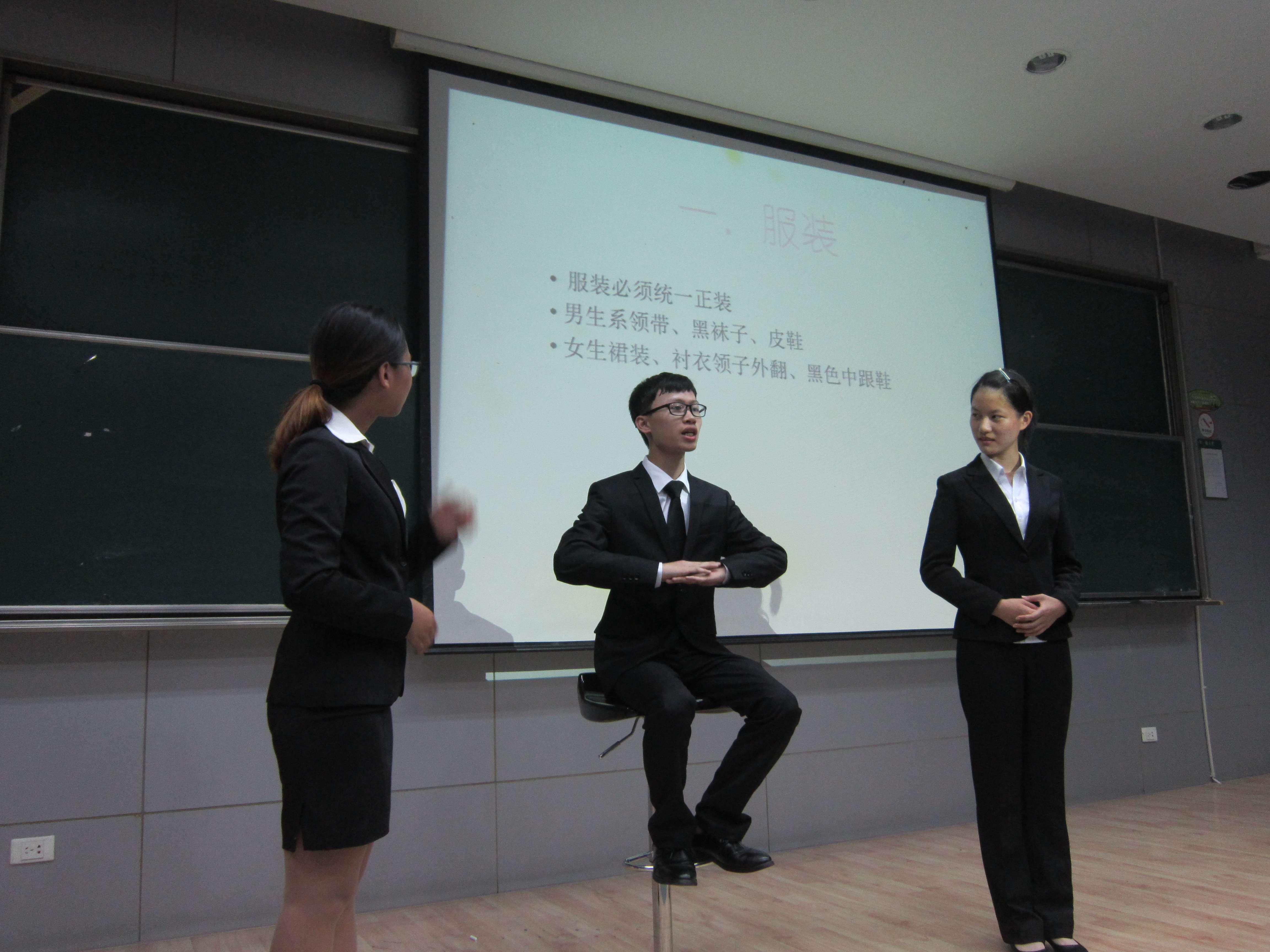 辩论赛除了需要相关材料的准备,得体的服装与恰当的礼仪也极为重要。对此,陈艳芳同学就男女辩手眼镜、服装、鞋子等细节进行了详细耐心的讲解,并对辩手的站姿与手势进行了阐释。为了增加活动的趣味性,她请上来三位身着正装的同学,让大家通过刚才所听的知识来挑刺,找出他们衣着方面不恰当的地方。同学们积极踊跃参加活动,大胆发表自己的看法,准确地找出了三位同学衣着的不恰当处。在欢笑声中,大家初步掌握了辩论的礼仪知识。