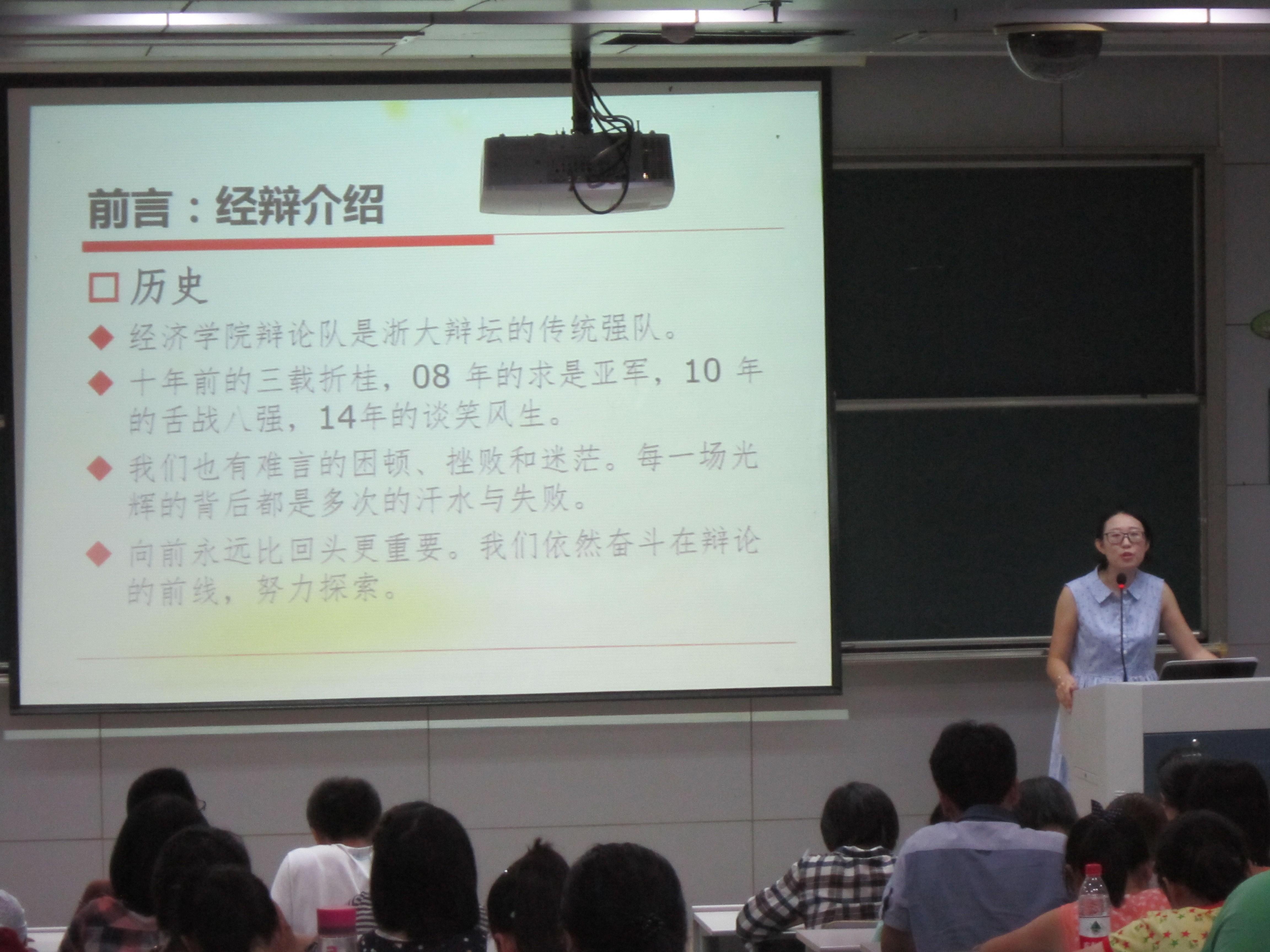 接着,宣讲会正式开始。率先出场的是来自经院辩论队的四辩——王濛同学。她旁征博引,为我们介绍了经院辩论赛的历史、特色与新人进队后的具体安排。她低沉大气的声音,有条不紊的思路,简洁而有节奏的讲解让同学们感受到了辩论选手的强大气场。而管院辩论队的何丛野同学在介绍了管辩队的特点与内部培训内容后,还向同学们展示了队员们在日常生活中的状态,让大家叹服于辩友之间深厚的友谊与辩论队的强大凝聚力。