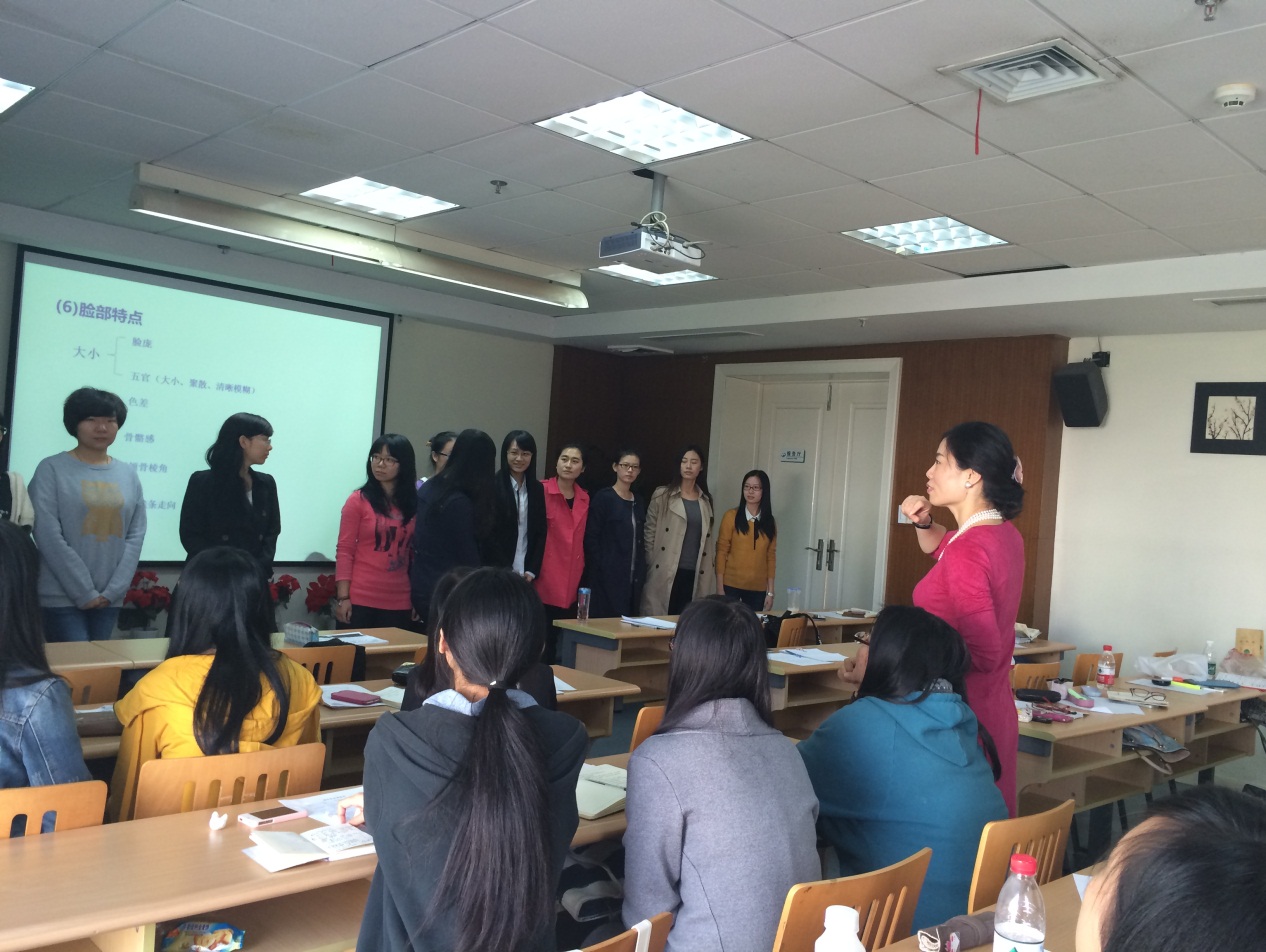 在讲到脸部特征的色差问题时,包老师请每个学员上台,通过不同学员肤色、肤质的对比讲解,让同学们更加深刻的理解了脸型、肤色对着装选择的重要影响,课堂气氛也由此达到了高潮。