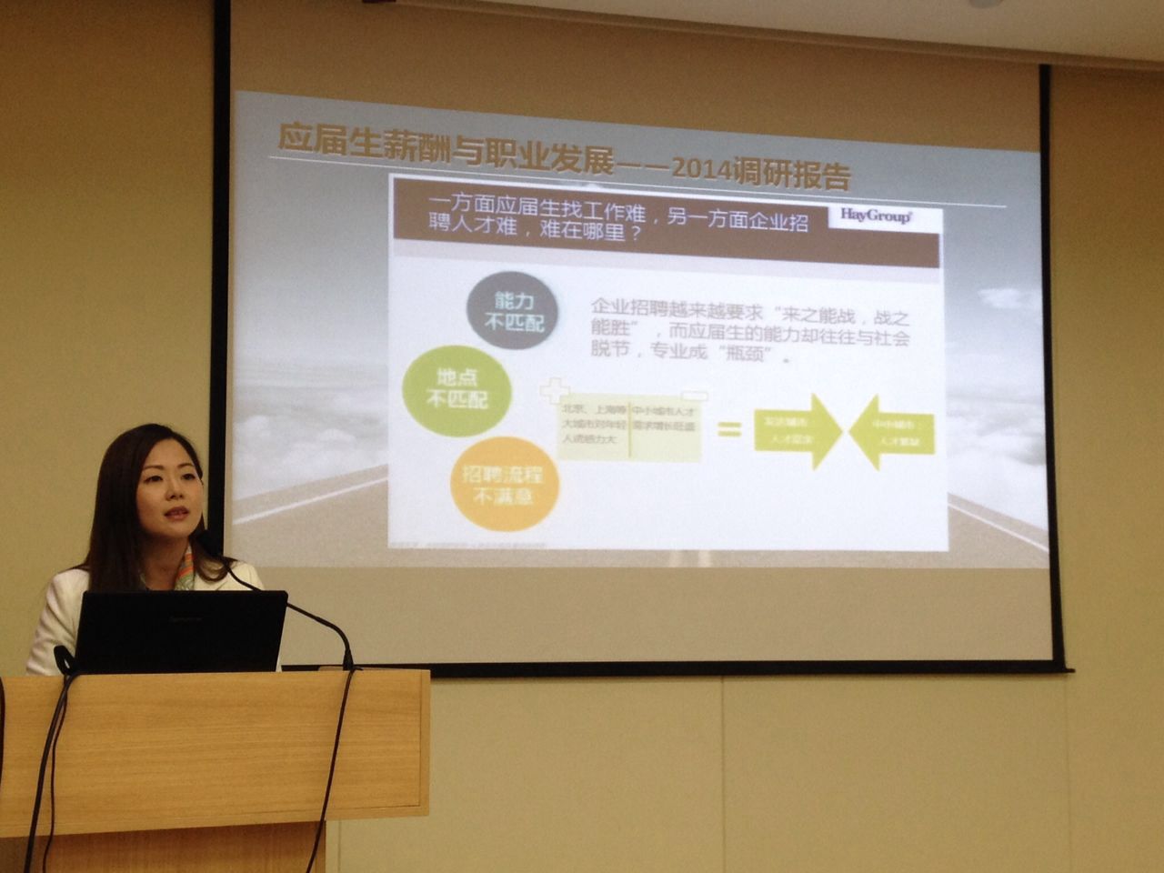黎老师首先为学员们展示了2014年应届生职业发展报告,并从企业人力资源主管的角度分享了她对报告的理解。结合当前的企业招聘环境和大学生的就业心态,她告诫学员,当前学生具备的学习能力和团队合作能力将成为企业最看重标准,企业希望年轻人能够拥有“来之能战,战之能胜”的品质。从企业角度来看,专业不对口、缺乏工作经验则是应届生就业的最大障碍。由此,黎洁老师强调了在一个岗位上踏踏实实工作的重要性,“在一个聪明人和一个踏实人中选择,管理者往往选择后者”,她希望我们将未来的工作看作学习的新的起点,在工作中放平心态,认真对待每一件小事,以刻苦和恒心展现自我,获得社会的尊重和认可。