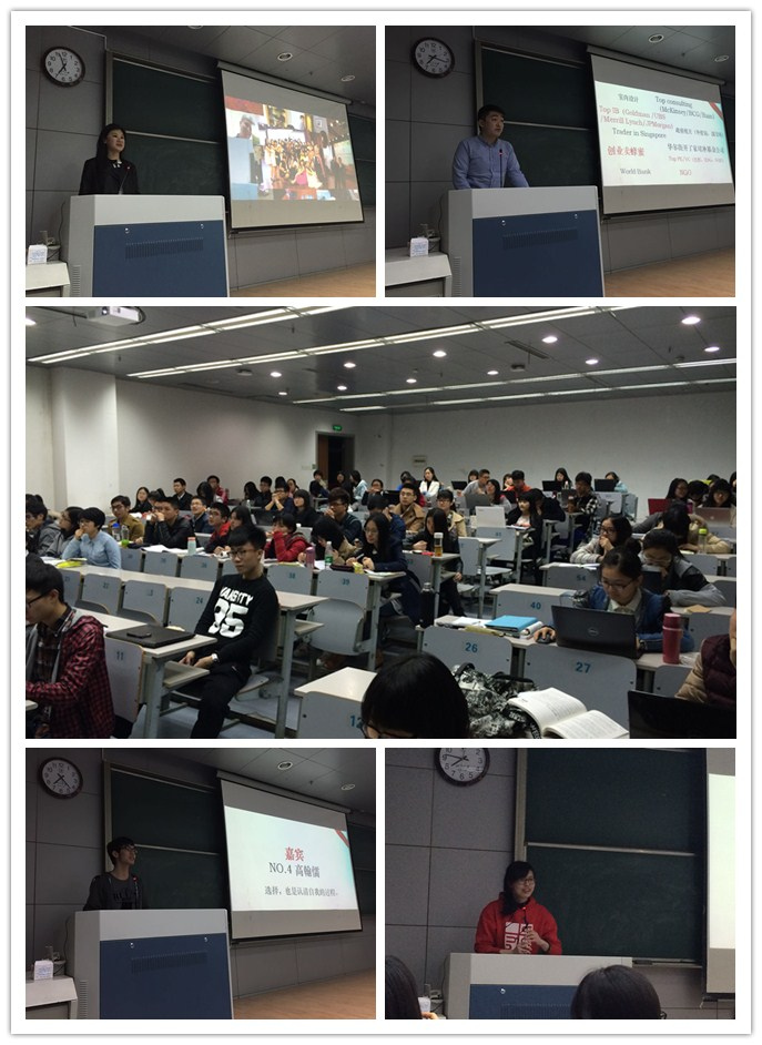 在主持人对申请金试的各个环节进行了简单的介绍后,率先由11级金试班的同学分别就各自保研、出国和就业的经历,为同学们介绍在金试班的学习和生活。保研至清华大学的鲍昀骁同学,在简单介绍了近几年金试外推的情况后,从学业角度分享了金试带给他的帮助。他风趣幽默,谈到金试独特的课程设置,同学间深厚的情谊,无不让人心生向往。成功申请MIT的杜晓宇同学,则为大家展示了金试班的一些珍贵照片,每一张照片都是一个属于金试的故事,仿佛诉说着美好的回忆。而在座的同学们也已经被这些故事所深深地吸引着。最后,即将入职赛富亚洲的石松源学长,为宣讲会再次融入激情。他先是让现场的同学们猜测PPT上展示的经历哪项是不属于他的,又让大家猜测PPT上丰富的毕业去向哪项是不属于金试班同学的,各种优异的经历让大家眼花缭乱,这个环节也在同学们欢乐的互动中圆满结束。