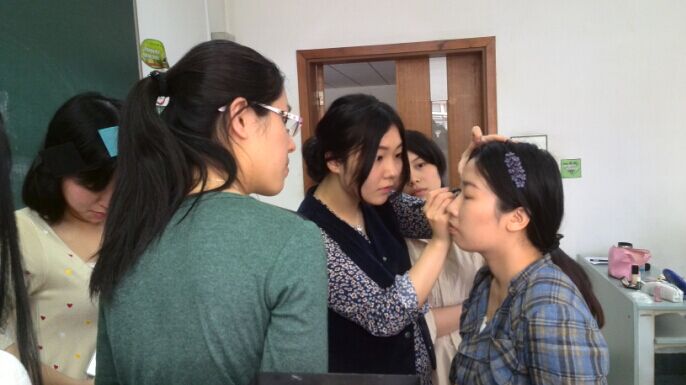 潘老师在打造模特美妆的同时不忘针对每一个化妆环节进行一步一步的具体指导,期间还认真回答学员们的疑问。学员们也热情高涨,跟随老师进行“实战演练”,并与同伴热烈讨论,现场气氛逐步提升。随后,潘老师贴心地给学员们给予专业的建议——如何选择各种乳霜粉底等化妆品,并强调每一个步骤的要点。模特在老师的巧手下如换一人,大家一拥而上纷纷围在模特身边惊叹化妆对女性气质形象带来的巨大改变。化妆培训接近尾声,同学们却热情高涨,纷纷围住潘老师询问关于修眉、化妆品颜色的选择与搭配等问题,现场气氛达到高潮。在为时近3小时的学习中,学员们获益匪浅,对女性的美有了更加真实的体验。