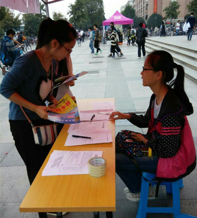 在大家的积极行动下,帐篷、桌椅都已迅速布置妥当,用以宣传招募的大字报也张贴完毕,本次志愿者招募活动随即正式开始。大家分工合作,一部分人坐在桌前负责记录报名信息,另一部分人则积极向经过的同学们介绍本次活动,并为对本次活动感兴趣的同学进行耐心的解答。