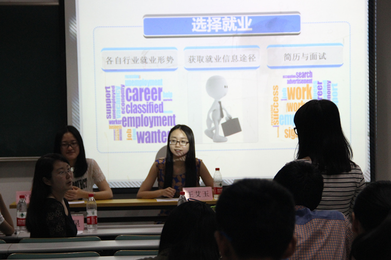 作为一名“商赛达人”,有着丰富模拟交易经验的张小星同学对行业前景分析得格外透彻,证券、私募等领域都在她的涉猎范围之内,而这些都与她在学校证券与投资研究会的工作经历密不可分。而黄澜同学作为春季求职大军中脱颖而出的一员,对解决面试过程中可能遇到的问题尤为擅长。她建议同学们可以在本科期间有针对性地选择社团,借此锻炼口才和胆识。雷依菡同学和王艾玉同学一开始都把目标定在出国深造上,然而机缘巧合之下,她们发现了适合自己的就业岗位。王艾玉提到,她所签约的深圳证券交易所在实习阶段就给她留下了深刻的印象;而雷依菡则坦言,她本人更钟情于外企的企业氛围,并与大家分享了针对外企的求职经验。由此可见,求职者与企业文化的契合是相当重要的。