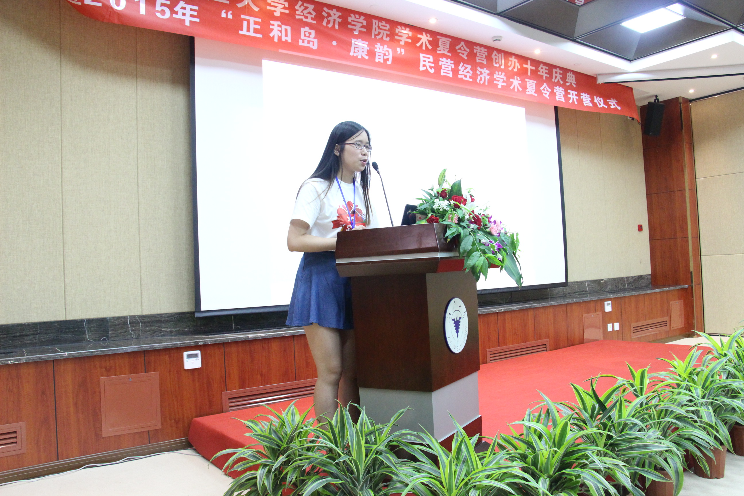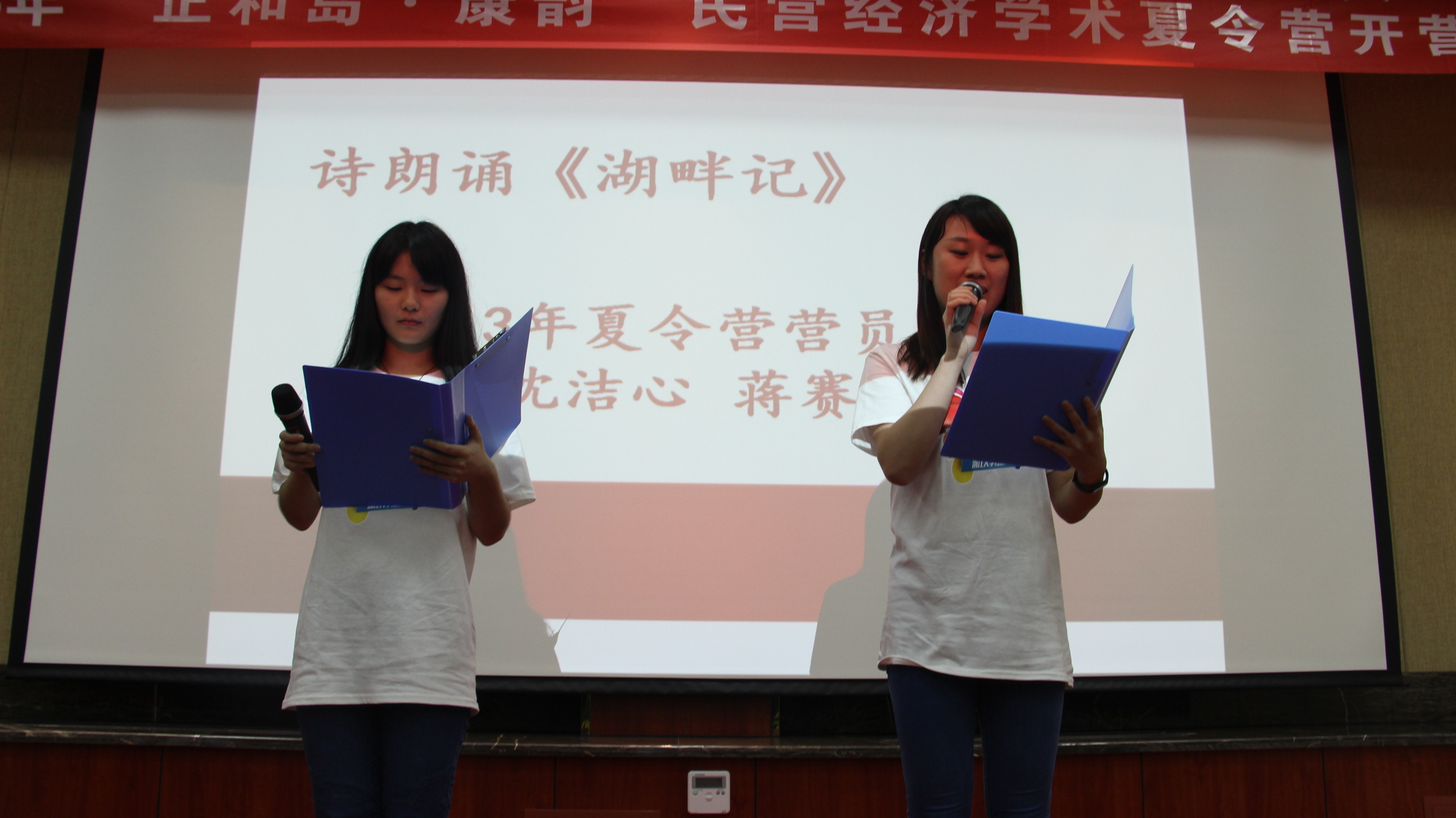 接着,正和岛企业家代表浙江六和律师事务所合伙人金伟文女士与本届夏令营赞助商杭州康韵生物科技有限公司董事长金建英女士也上台致辞,表达了营员们的美好祝愿与期盼。沈洁心同学与蒋赛楠同学代表2013年老营员表演了诗朗诵《湖畔记》,深情过后,本届营员代表张群同学也代表2015年全体营员上台发言,向大家展示了营员们的志向与能力。