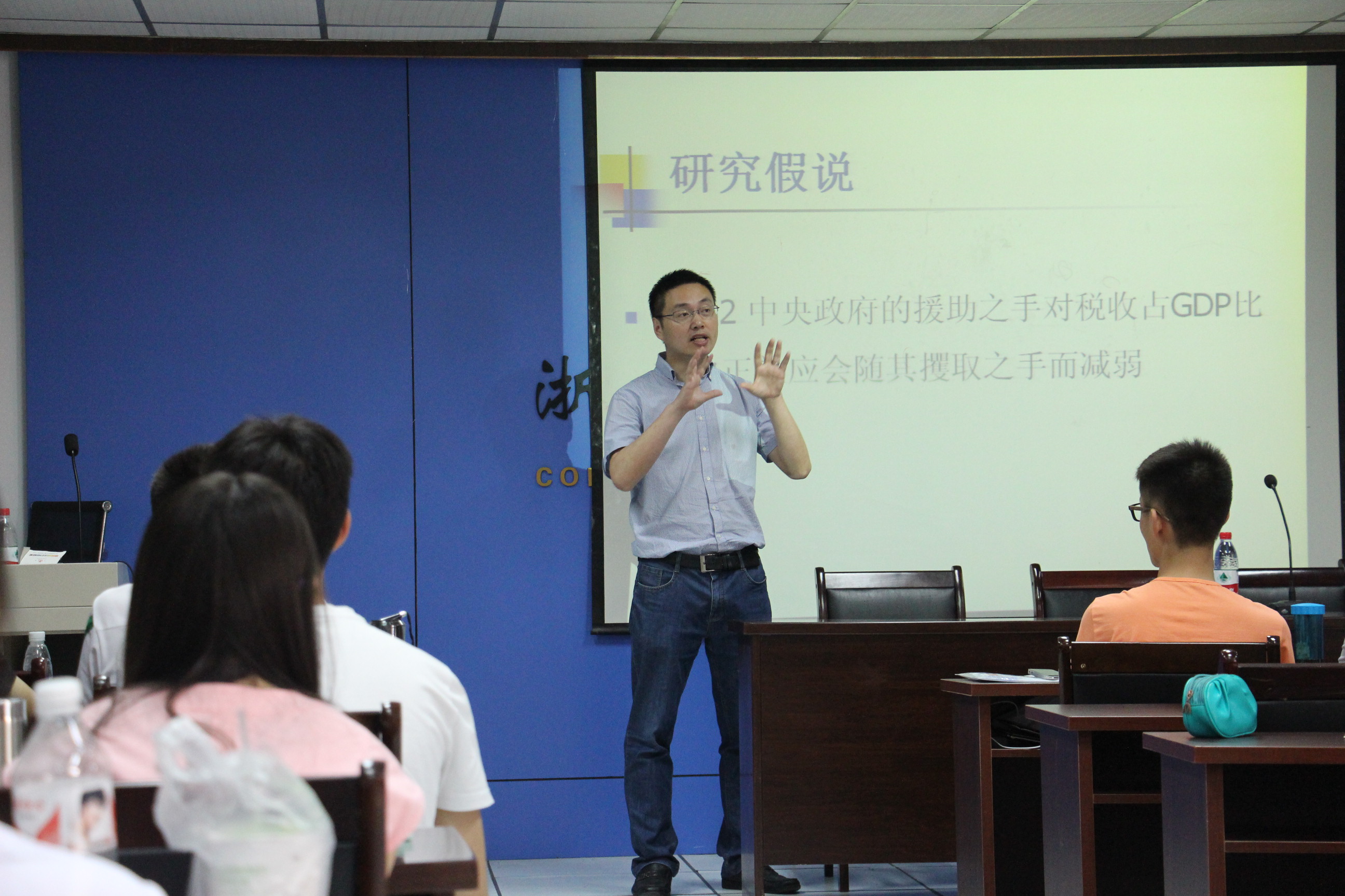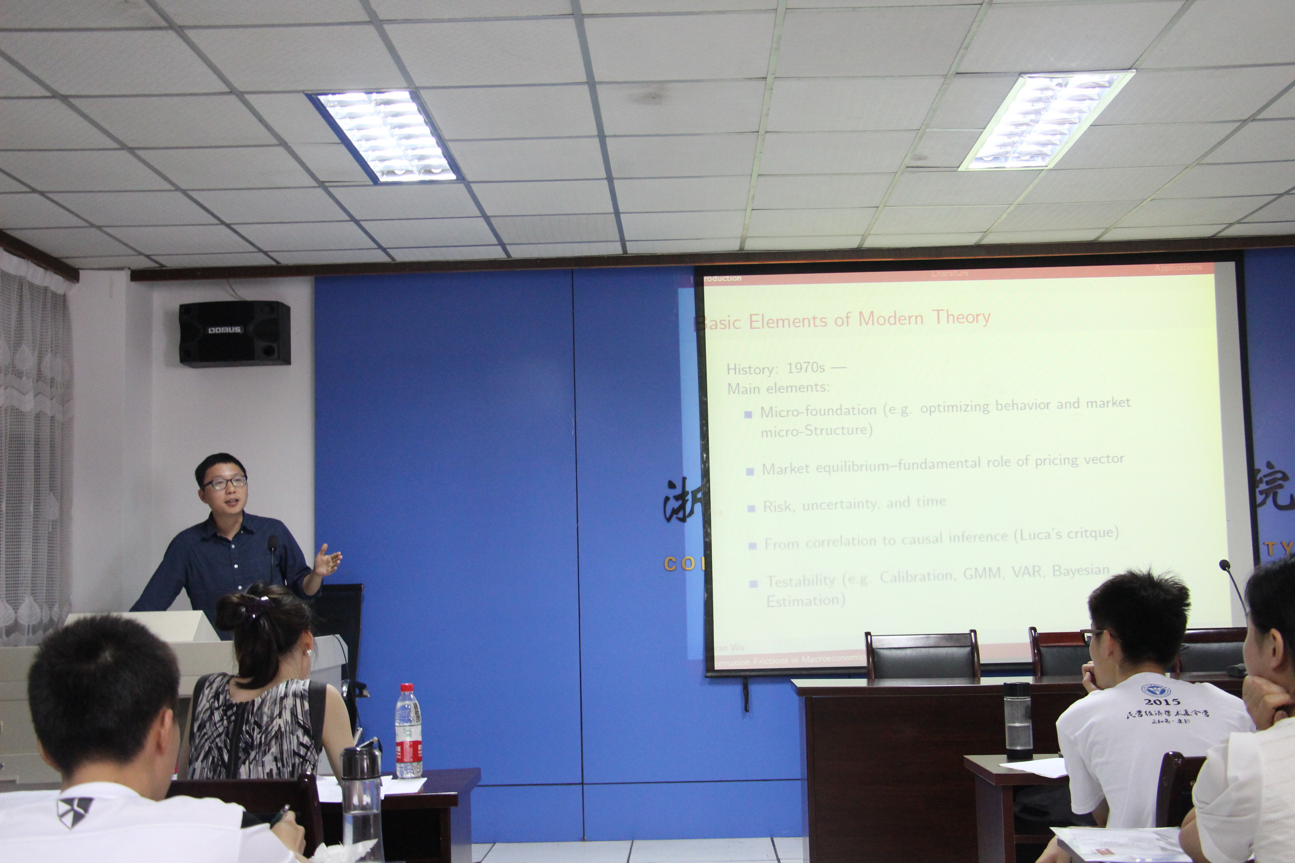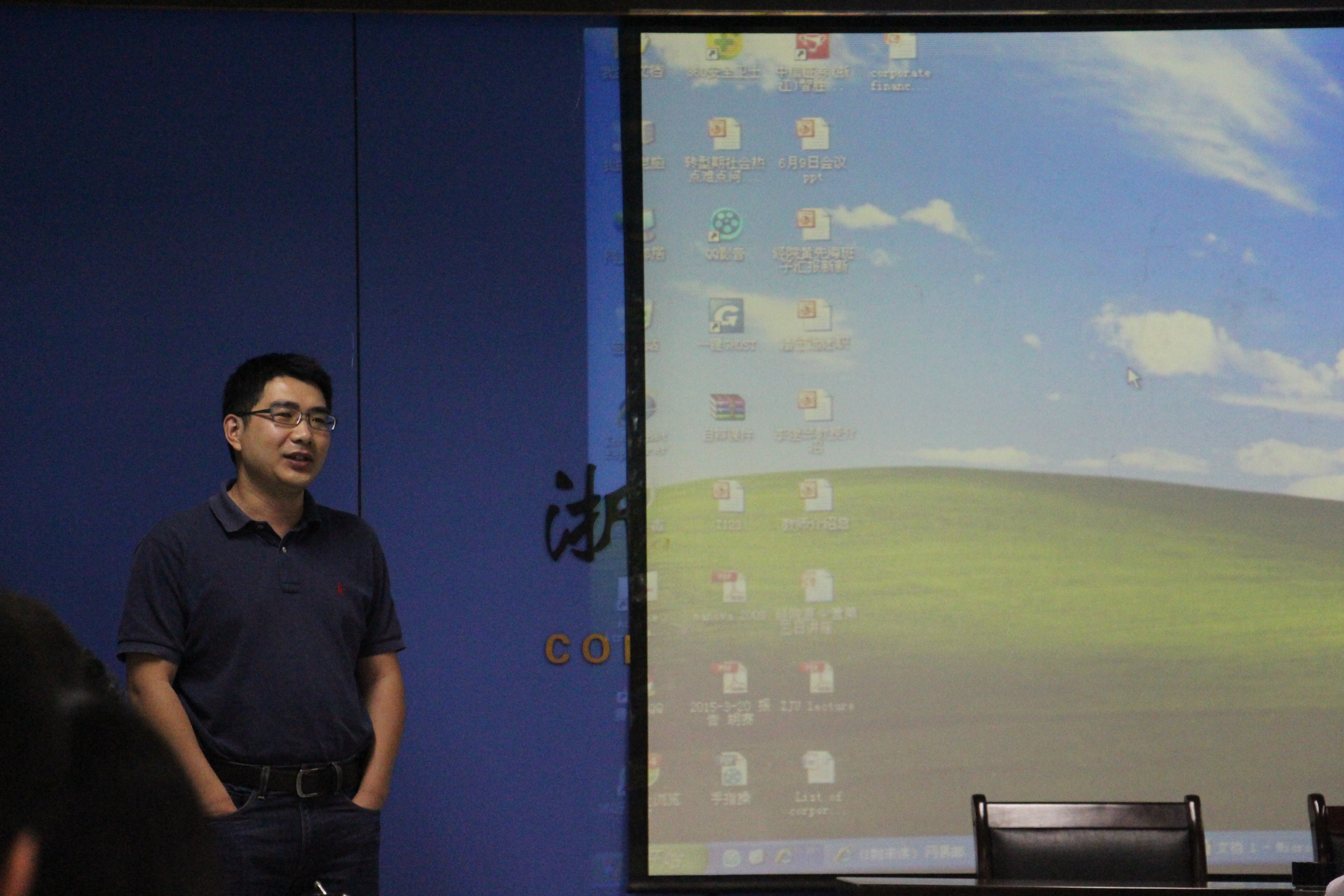 首先开讲的是从美国归来不久的邬介然老师,他讲授的主题是Information Frictions in Macroeconomics and Finance。他首先回顾了宏观经济金融研究的历史发展过程和理论基础,并由风险和未知性问题引入到前沿研究介绍,同时指出信息这一概念在宏观经济金融研究中的复杂性和重要性。邬老师提到的“丁蟹效应”等股市中由于信息不对称造成的有趣现象,引起了同学们的极大研究兴趣。