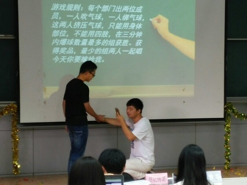 本科生分团委是一个有爱的大家庭,所以部门间的互动当然也是必不可少的环节,一个“亲密接触”的游戏将破冰大会推向了另一个高潮。参赛的同学两两配合吹气球、扎气球,再用身体将气球挤爆。爆破声和呐喊声在场地内此起彼伏。除了游戏过程本身,丰富的小奖品和有趣的小惩罚更是增添了其中趣味。