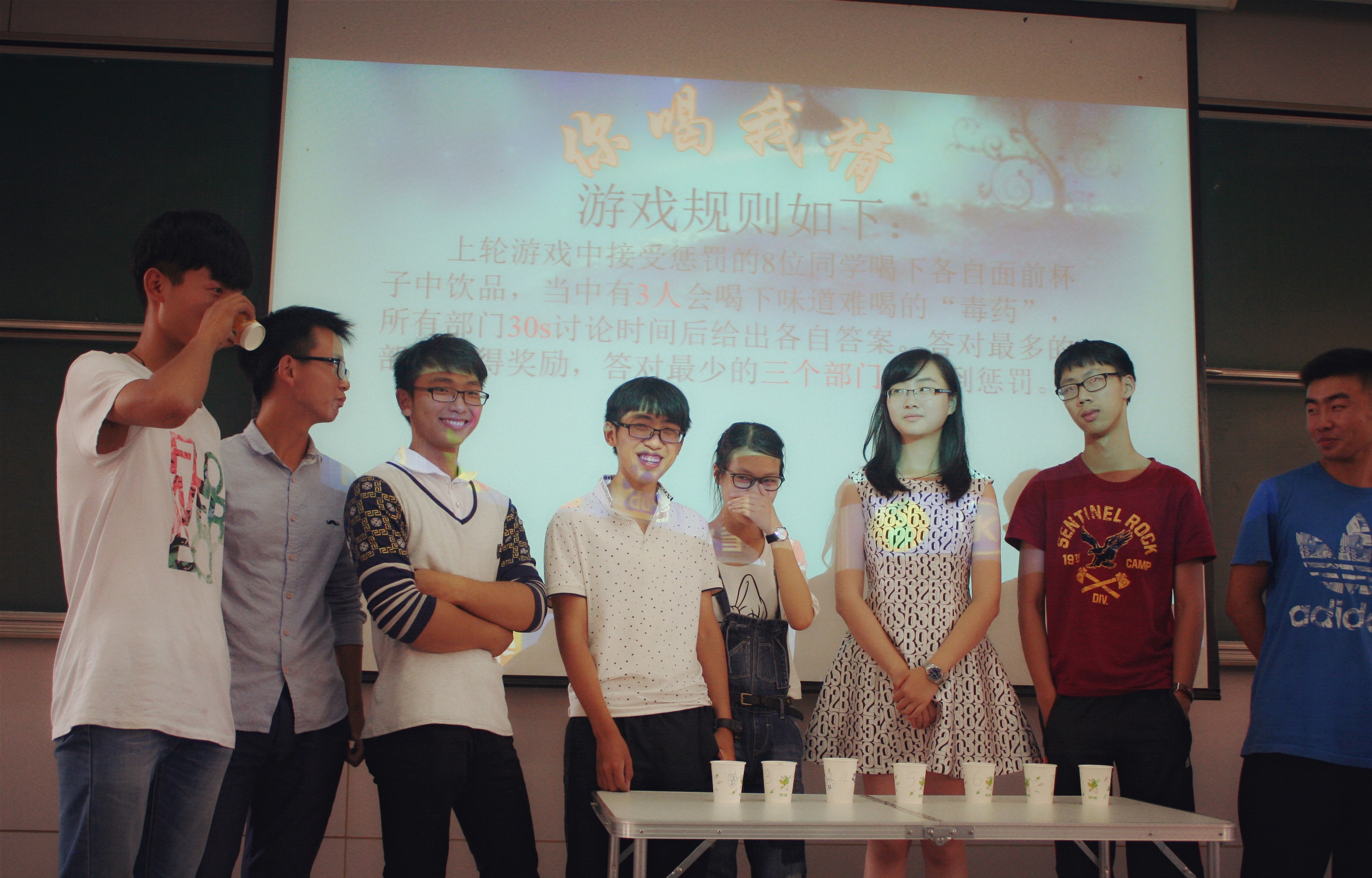 在游戏环节中,各个部门派出的代表在趣味竞答里斗智斗勇,拼智力、拼手速、拼人品。在“你喝我猜”环节中,同学们使出浑身解数,想要骗过台下观众的眼睛。游戏中失利的一方接受的小惩罚“听着神曲唱校歌”更是充分点燃了大家的热情,将大会的气氛推向高潮。
