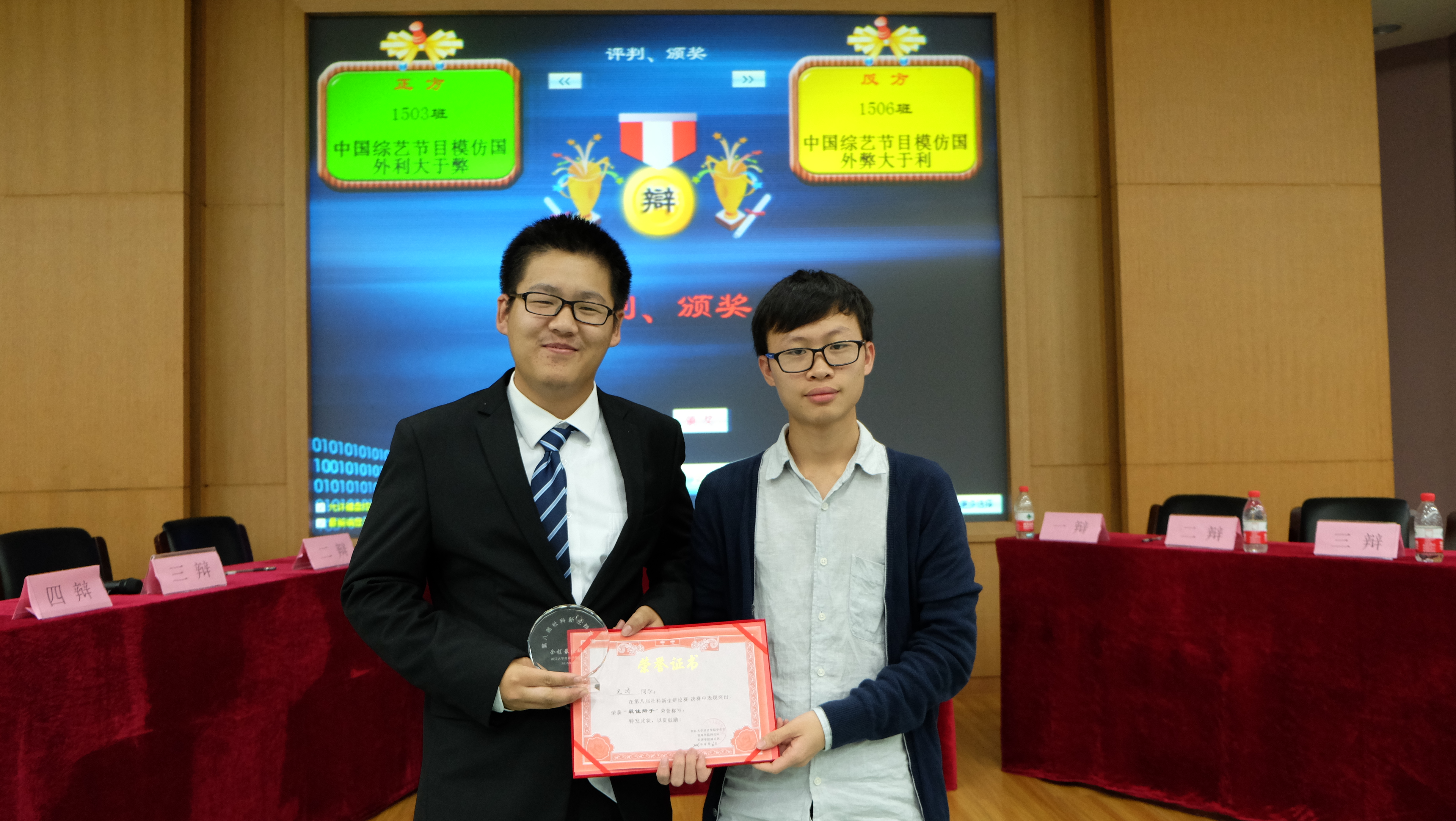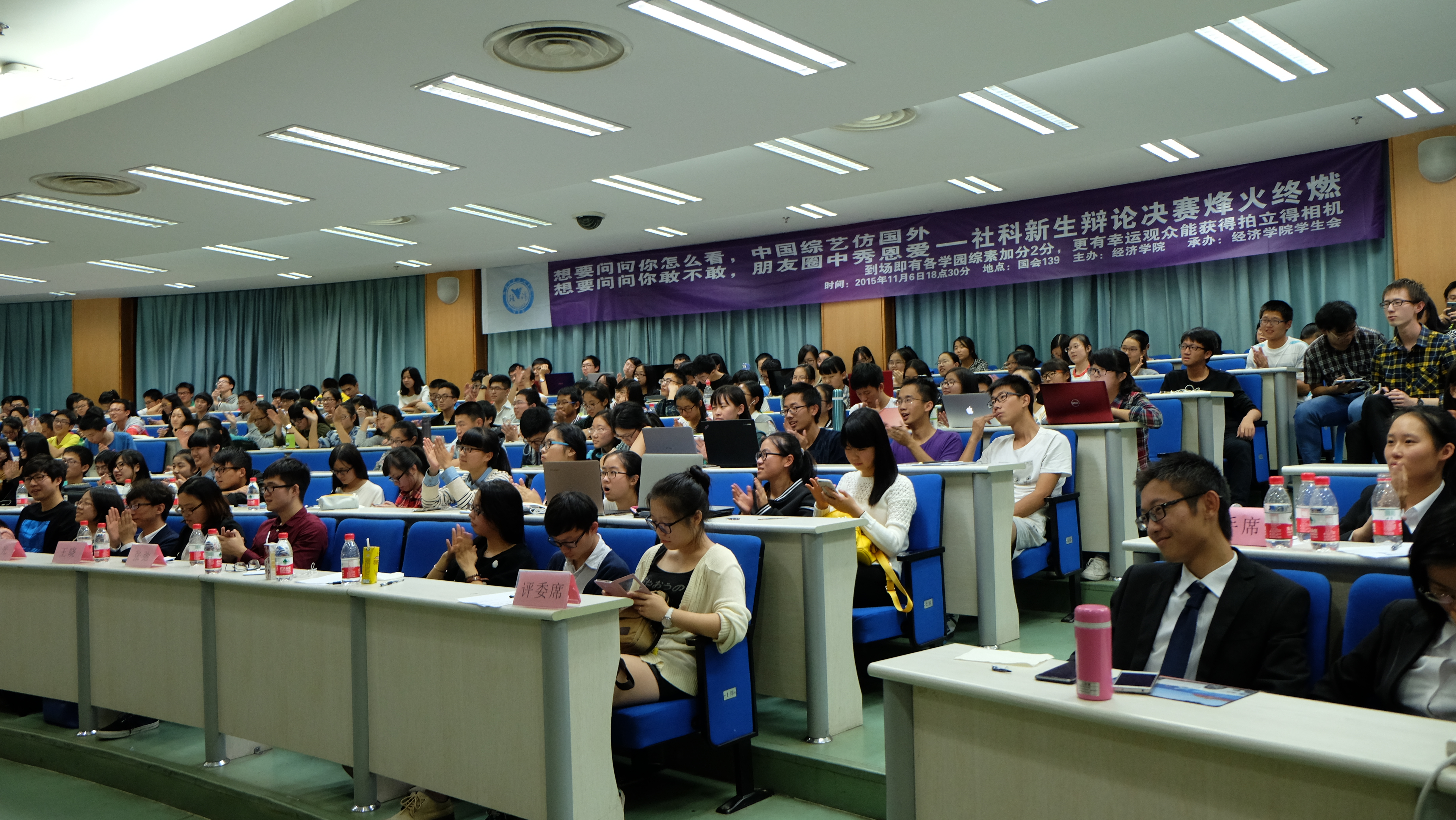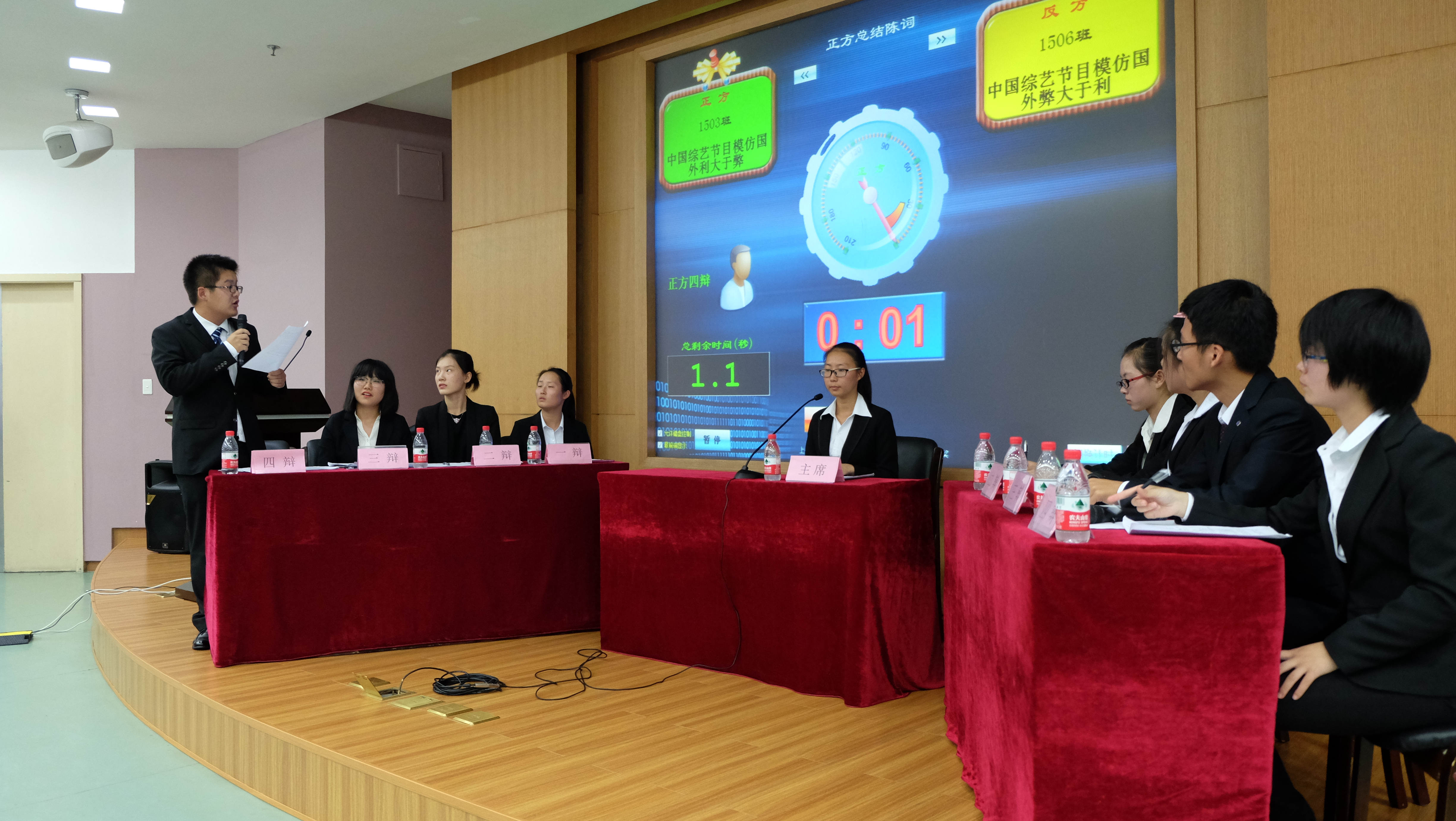 来自社科1503班的辩论队先声夺人,提出中国综艺节目模仿利大于弊的观点,并从电视行业经济效益、个人业余电视娱乐选择和电视公共服务职能三方面进行了充分而有力的论述。反方社科1506班不甘示弱,他们强调国内综艺节目模仿国外打击了创新积极性,使综艺发展走向病态化和利益化,因而弊大于利。双方皆是唇枪舌剑,步步紧逼,使现场充满火药味,并不时以连珠妙语博得观众阵阵喝彩。