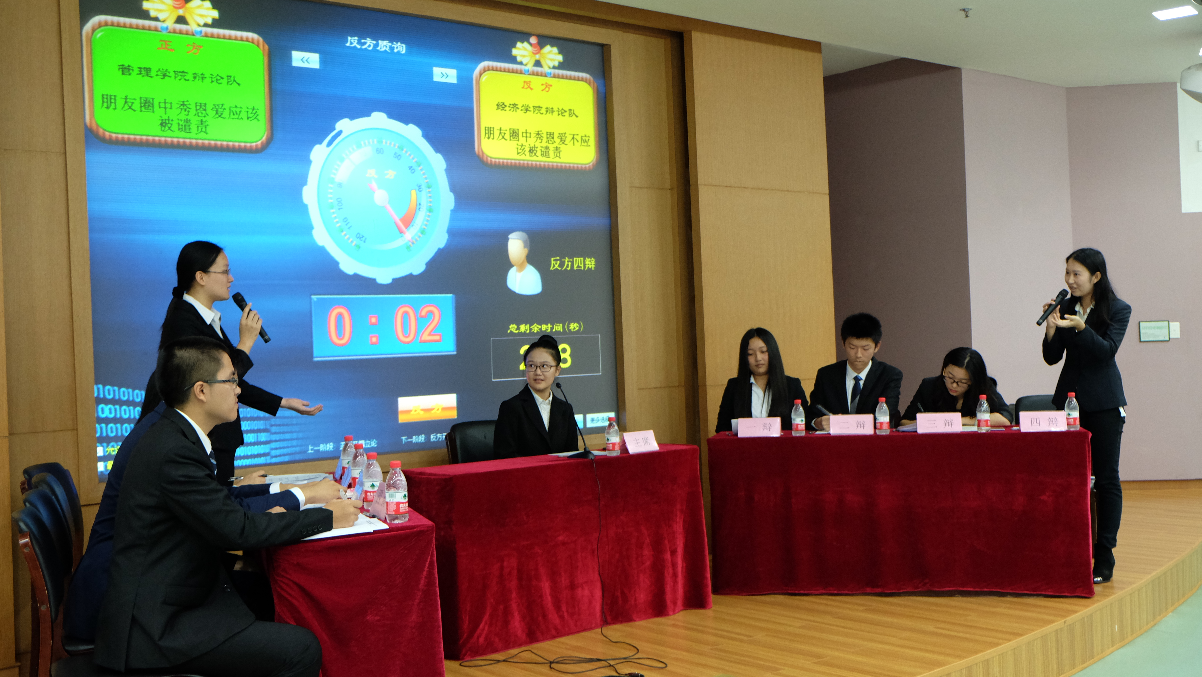 接着,来自威尼斯144777欢迎您辩论队和管理学院辩论队的八位久经沙场的辩手为大家呈现了一场轻松风趣的表演赛。围绕“在朋友圈中秀恩爱该不该被谴责”这一话题,双方尽显无双辩才,据理力争同时还不忘互相调侃,引人发笑。