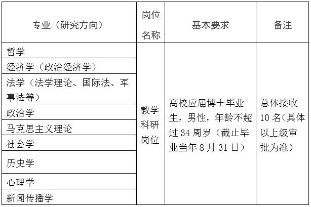 3.性别及年龄要求:原则上仅限男性,年龄不超过34周岁(截止毕业当年8月31日),少数民族和曾服现役的毕业生,年龄可适当放宽1岁。
