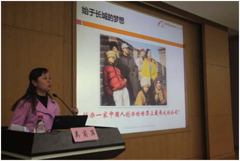 在讲述完自己的故事后,吴妈妈怀着感恩的心回顾了阿里十六年的发展和公司的文化建设,启发同学们以互联网精神为祖国的发展贡献力量。吴妈妈从阿里的起步与发展开始,向我们介绍了阿里以诚信为底线的企业文化和激情敬业的阿里精神,以及阿里在社会公益方面做出的不懈努力。
