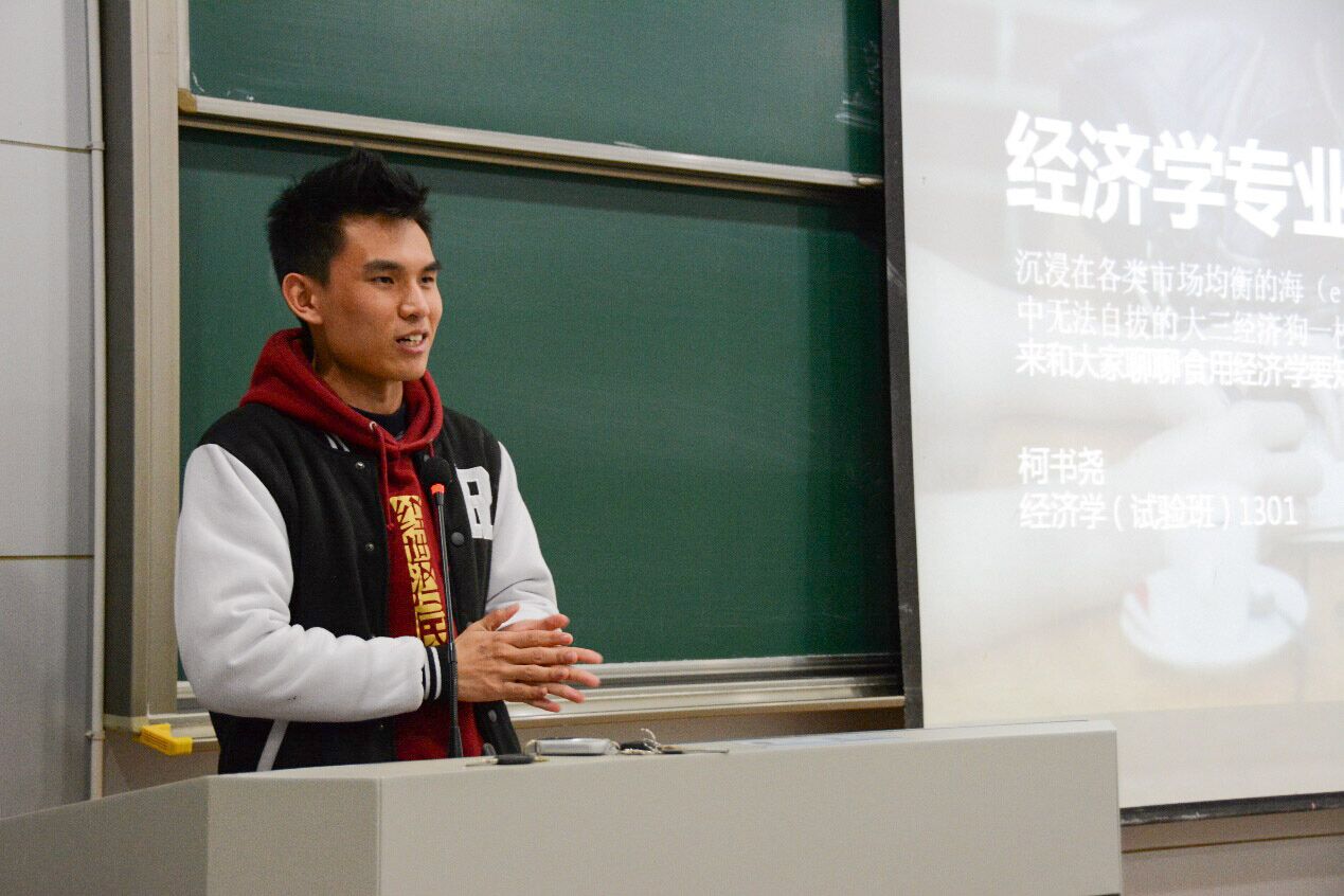 “苦,但就是喜欢经济学,任性!”2013级的柯书尧同学这样打趣自己。柯学长为大家讲述了不少经济学理念,令新生们大开眼界。在分享中,他着重强调了逻辑思维,并笑称没有好的逻辑思维就无法成为好的经济学家。他还提到,经济学对于数学的要求是比较高的,课程相对也较抽象与枯燥,“虽然苦但是很有意义,因为兴趣所在,所以还是希望大家能够充分考虑,选到自己真正喜欢的专业”。