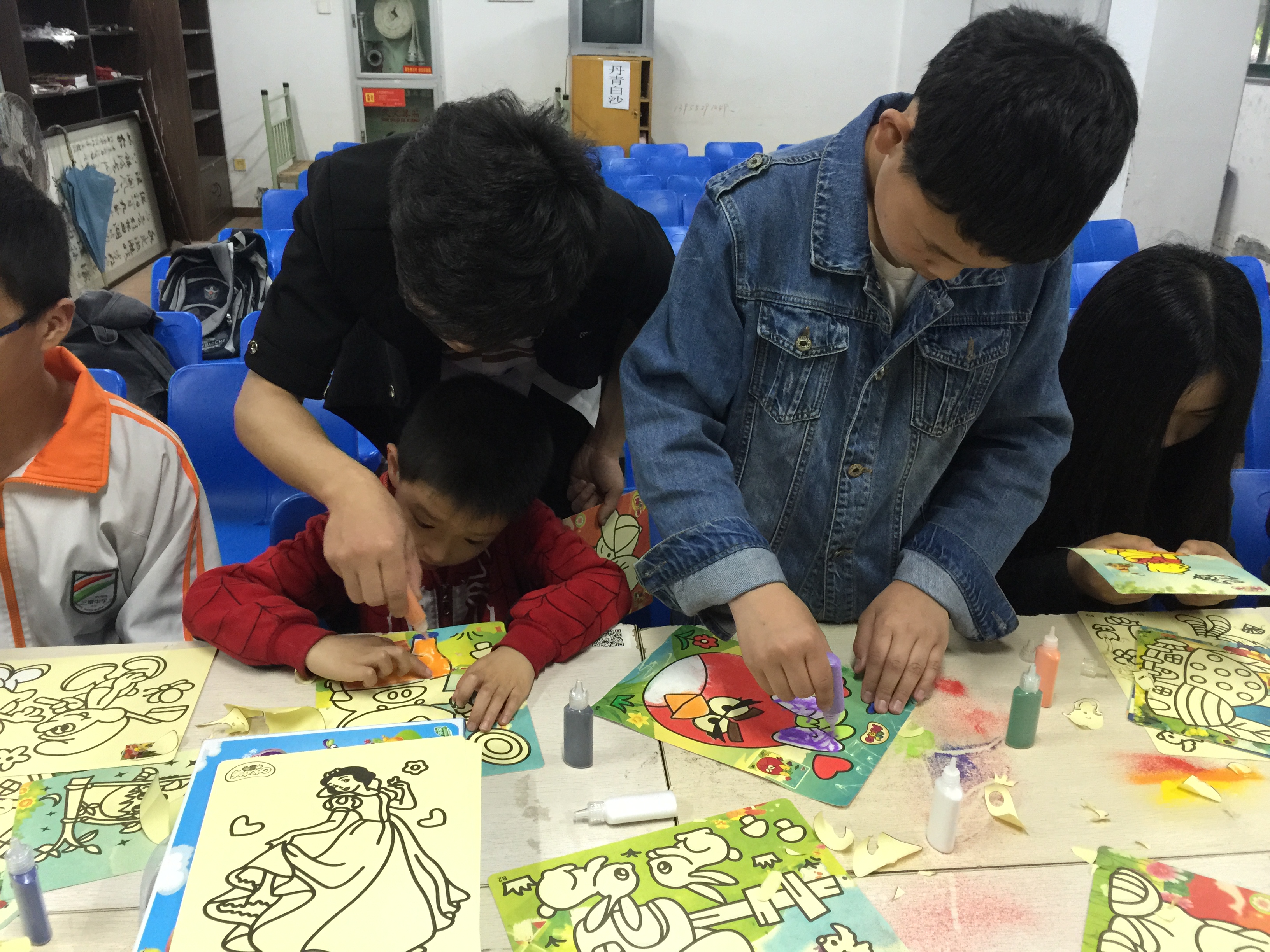 本次活动中,小朋友们先互相熟识和交流,然后一起前往新宇活动室。我们的志愿者精心准备了不同图案的沙画。有男孩子喜欢的功夫熊猫,也有女孩子喜欢的白雪公主等。画好图案的不干胶模板上面的每一部分均有提前刻出的轮廓,小朋友们在做画的时候轻轻将每一部分揭起,然后充分发挥了自己的想象力,和志愿者们一起将喜欢的颜色的沙子倒在上面。