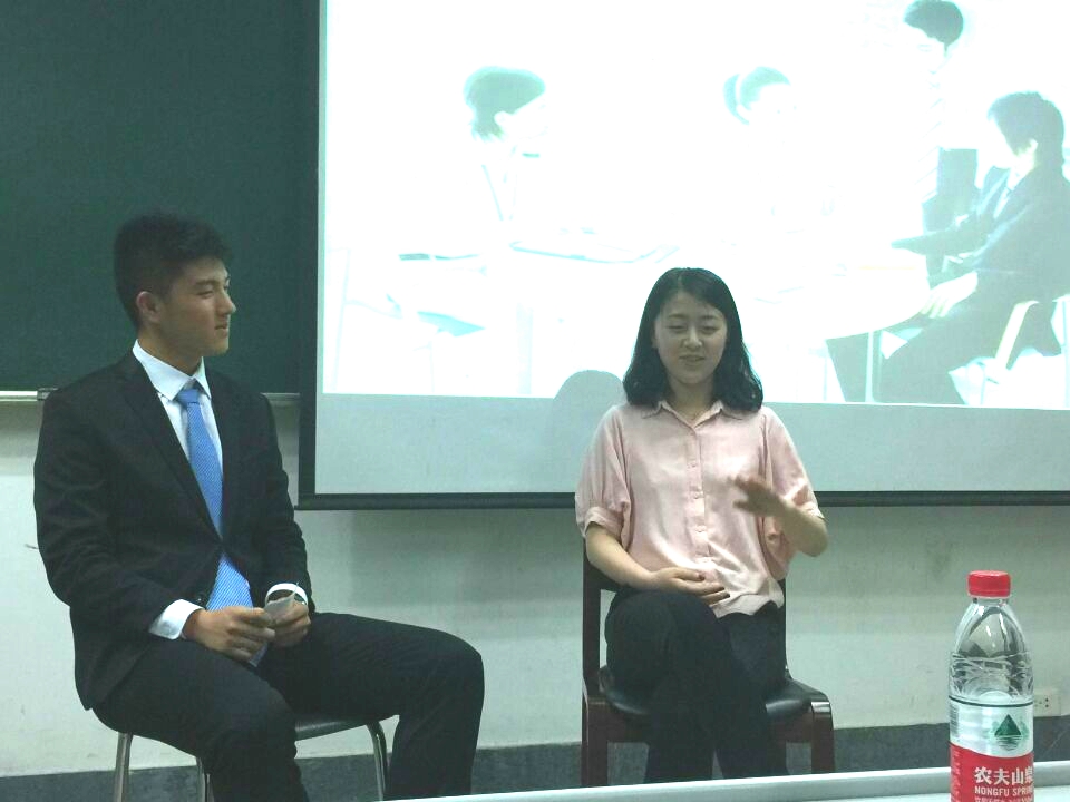 随后,来自金融学专业、现已考入中国人民银行嘉善支行的的浦阅婷同学与大家分享了她选择工作时的心路历程。浦阅婷细致耐心地分析了大学生在就业选择过程中可能面临的种种困难,并介绍了很多面试的技巧。