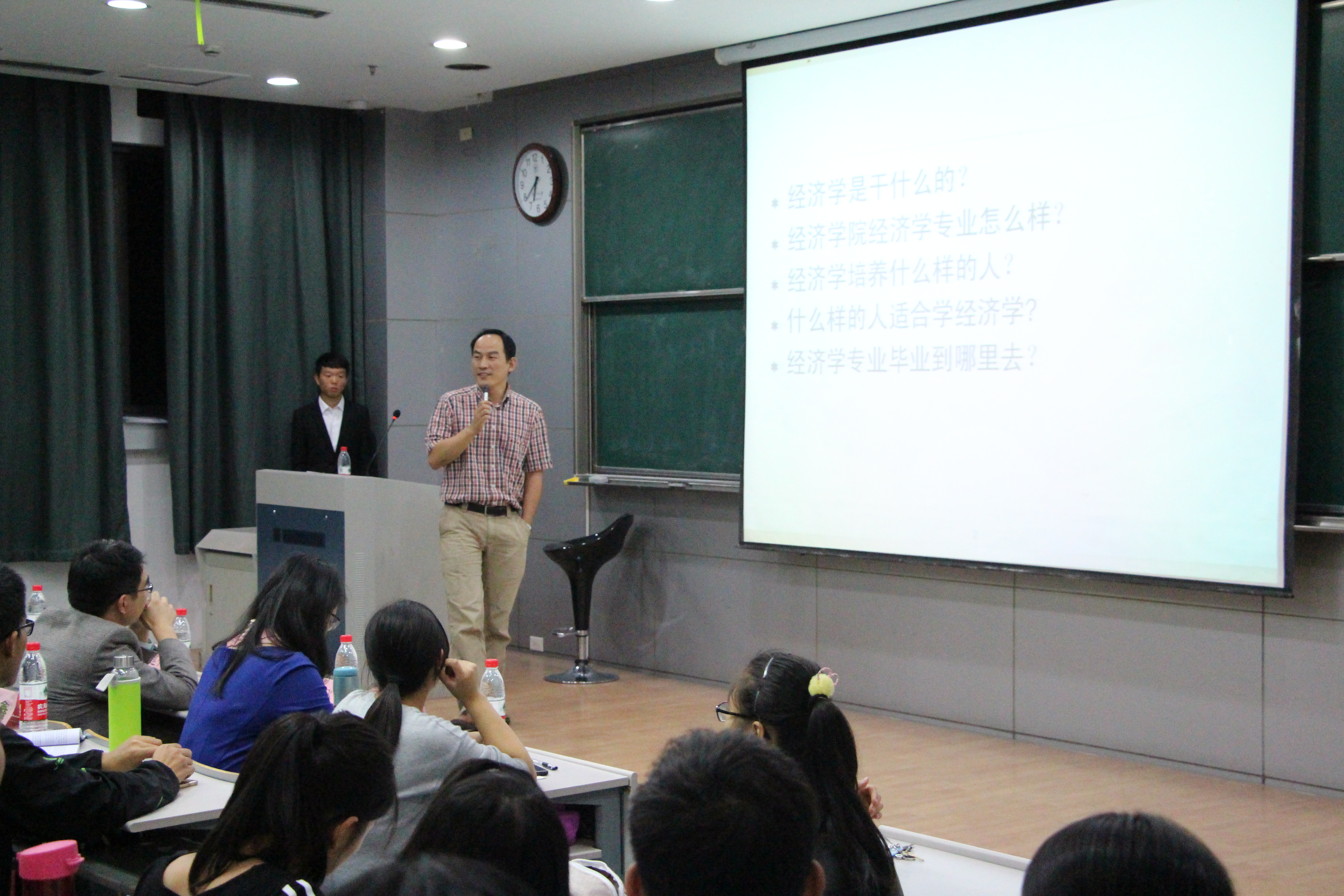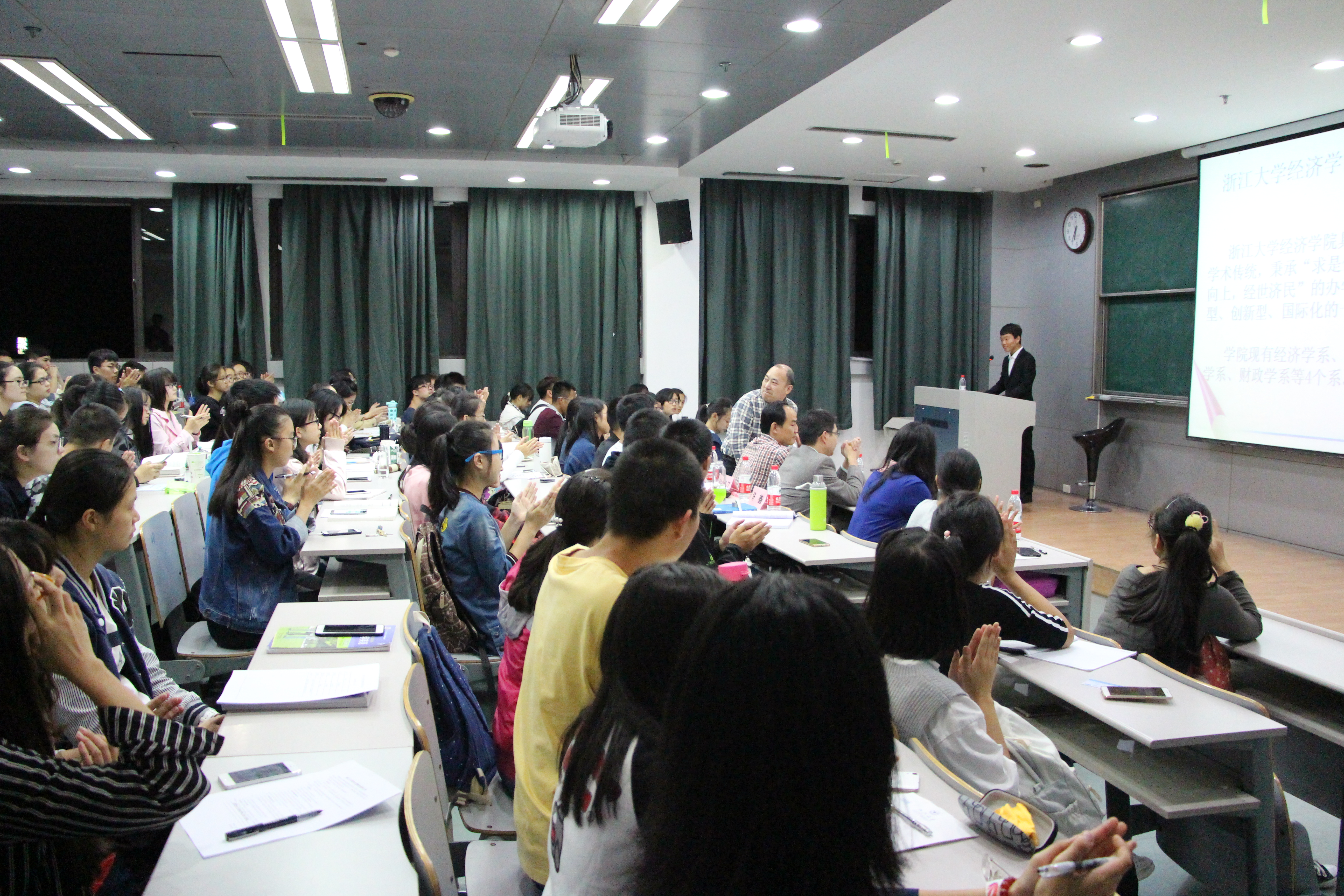 转眼间,树叶变黄脱落,秋天已悄悄来临,16级的小鲜肉们进入浙大已一月有余,本学期的头等大事——主修专业确认也已经迫在眉睫。经过近半个月的筹备,10月11日晚上6:30,威尼斯144777欢迎您专业宣讲会在西2-105教室正式开始,经济学系副系主任叶建亮老师,金融学系副系主任朱燕建老师,国际经济学系副系主任陆菁老师,财政学系副系主任周夏飞老师以及本科生教学科科长范良辉老师及各系优秀学长学姐共同参与了本次活动。