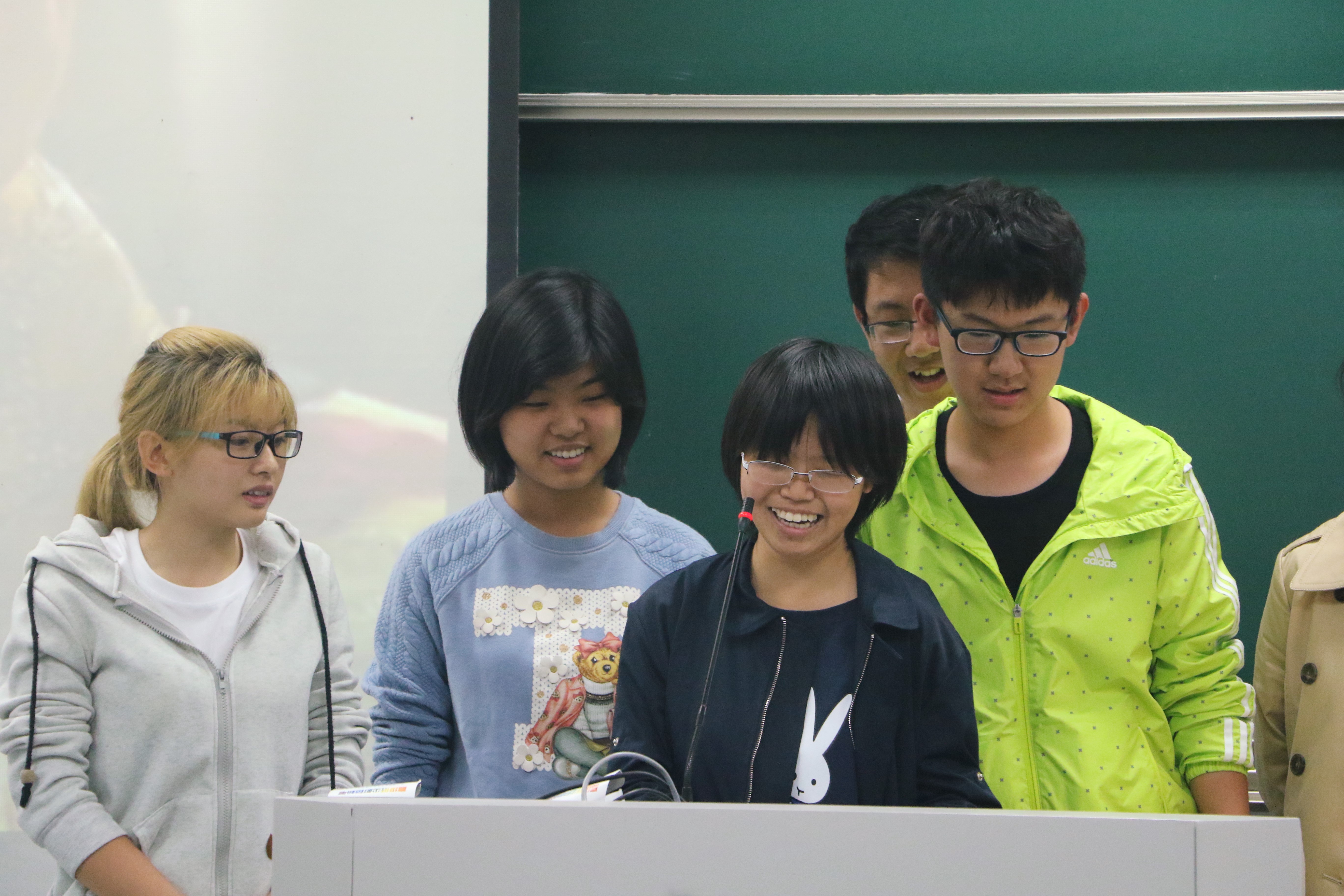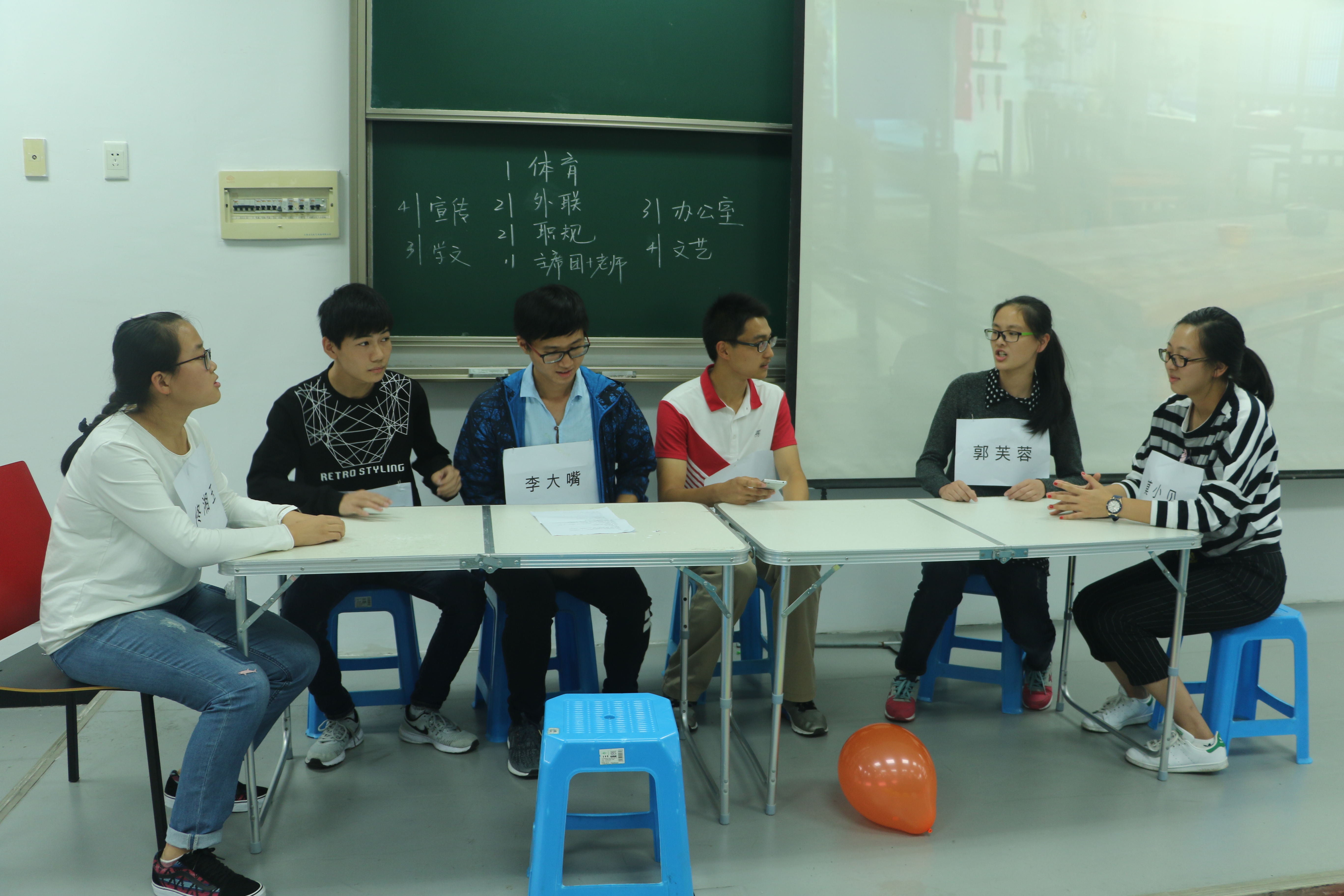 紧接着就是各个部门准备已久的展示。首先是学术文化中心带来的歌曲串烧,《新贵妃醉酒》等曲目让同学们印象深刻,部门的其他同学则随着歌声配合摆手舞,十分生动。接下来是宣传部以“我遇见的萌宣”为主题的部门展示,他们的小短剧以正流行的电视剧《微微一笑很倾城》为主线,穿插了主题曲演唱和《武林外传》话剧表演,风趣而且幽默。之后便是第一个小游戏“记名字萝卜蹲”,紧张的30秒展示名字和记忆后,参加游戏的同学们便面朝观众开始了快速地报名字接力,同学们在这个游戏中熟悉了彼此的名字。