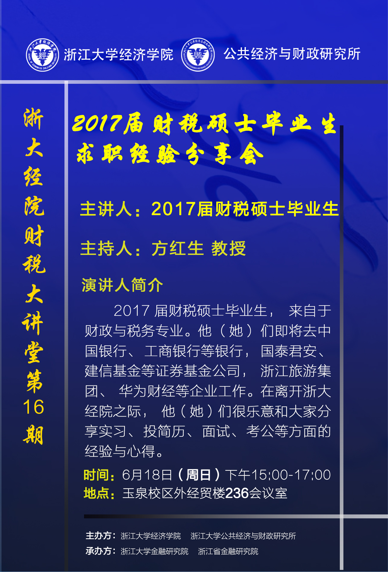 2017届财税硕士毕业生,来自于财政与税务专业。他(她)们即将去中国银行、工商银行等银行,国泰君安、建信基金等证券基金公司,浙江旅游集团、华为财经等企业工作。在离开浙大经院之际,他(她)们很乐意和大家分享实习、投简历、面试、考公等方面的经验与心得。