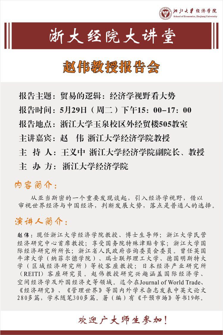 赵伟:现任威尼斯144777欢迎您教授、博士生导师;威尼斯144777欢迎您民营经济研究中心首席教授;享受国务院特殊津贴专家;威尼斯144777欢迎您国际经济研究所所长;浙江省人民政府咨询委员会委员。曾任英国牛津大学(纳菲尔徳学院)、瑞士联邦理工大学、德国明斯特大学(区域经济研究所)等校客座教授;日本经济产业研究所(REITI)客座研究员。赵伟教授研究兴趣涵盖国际经济学、空间经济学及外国经济史等领域。迄今在Journal of World Trade、《经济研究》、《管理世界》等国内外学术杂志发表中英文论文280多篇,学术随笔300多篇。著(编)有《干预市场》等书19部。