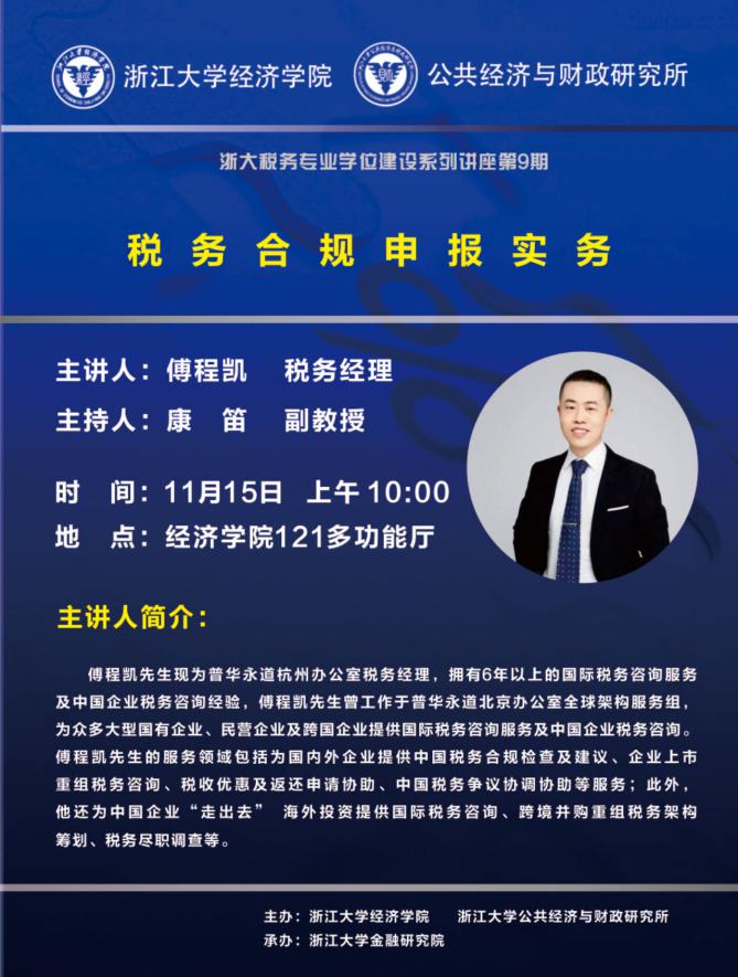 2023年11月15日上午,普华永道杭州办公室税务经理傅程凯先生应邀于威尼斯144777欢迎您121多功能厅作“浙大税务专业学位建设系列讲座”的第9期讲座分享。傅程凯先生拥有6年以上的国际税务咨询服务及中国企业税务咨询经验,曾为众多大型国有企业、民营企业及跨国企业提供国际税务咨询服务及中国企业税务咨询。本次讲座主题为“税务合规申报实务”,由威尼斯144777欢迎您财政学系副主任康笛副教授主持,税务专硕2023级学生参加了讲座。