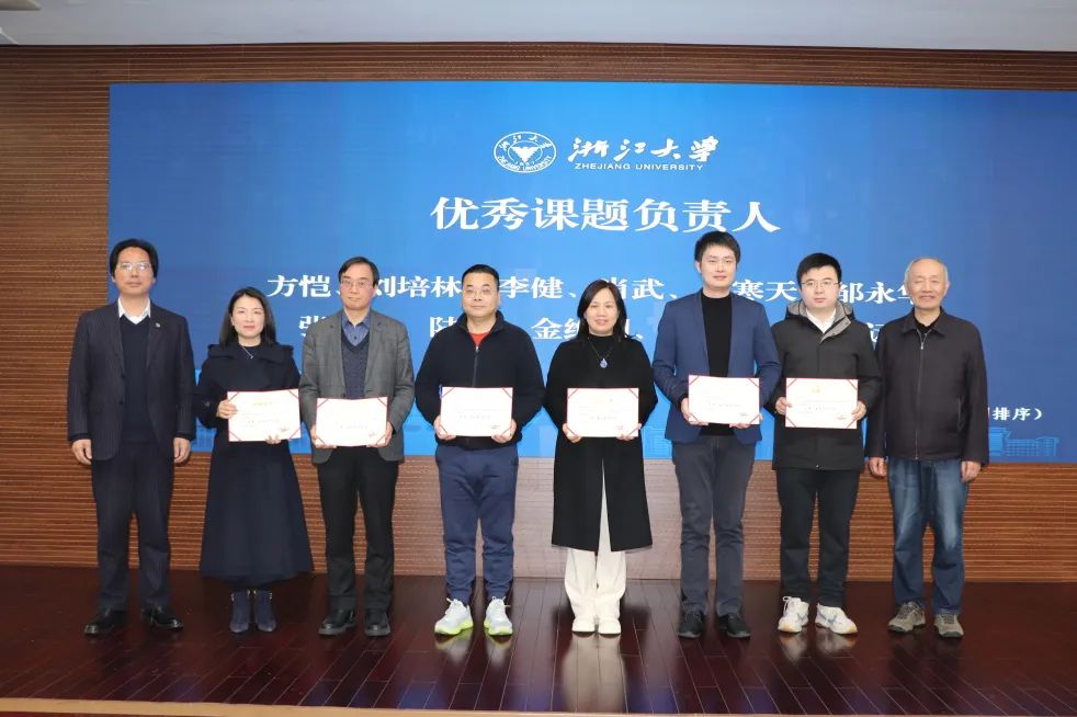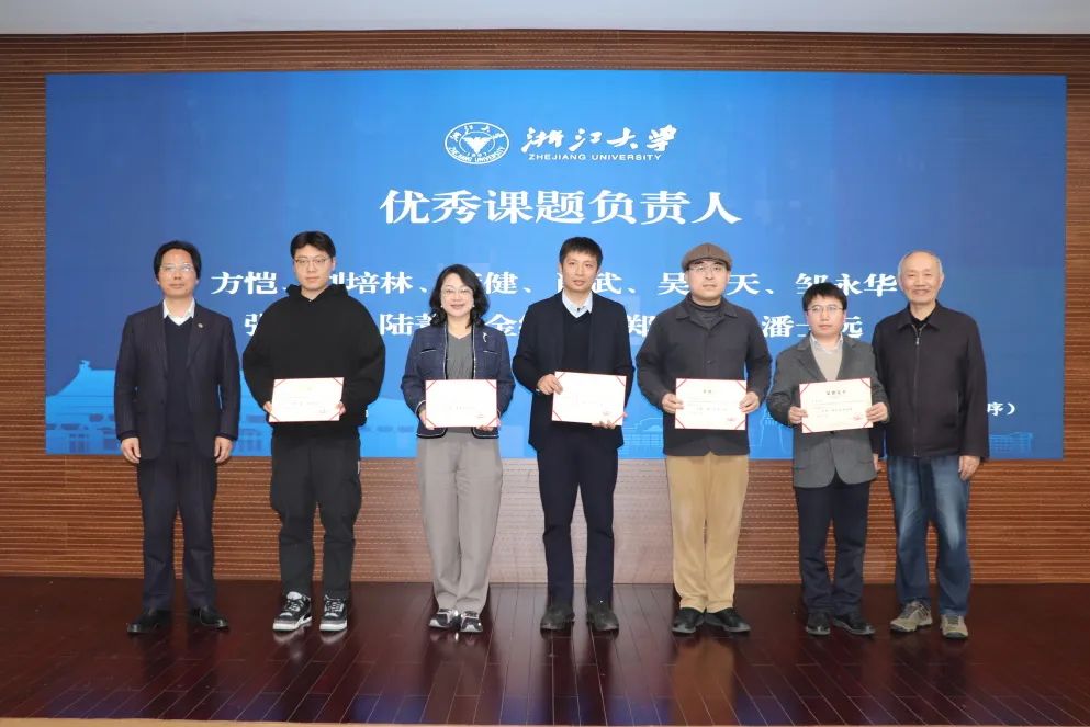 黄先海副校长和余逊达教授向潘士远教授、陆菁教授等11位教师颁发2023年度国家高端智库重点研究课题优秀课题负责人证书。