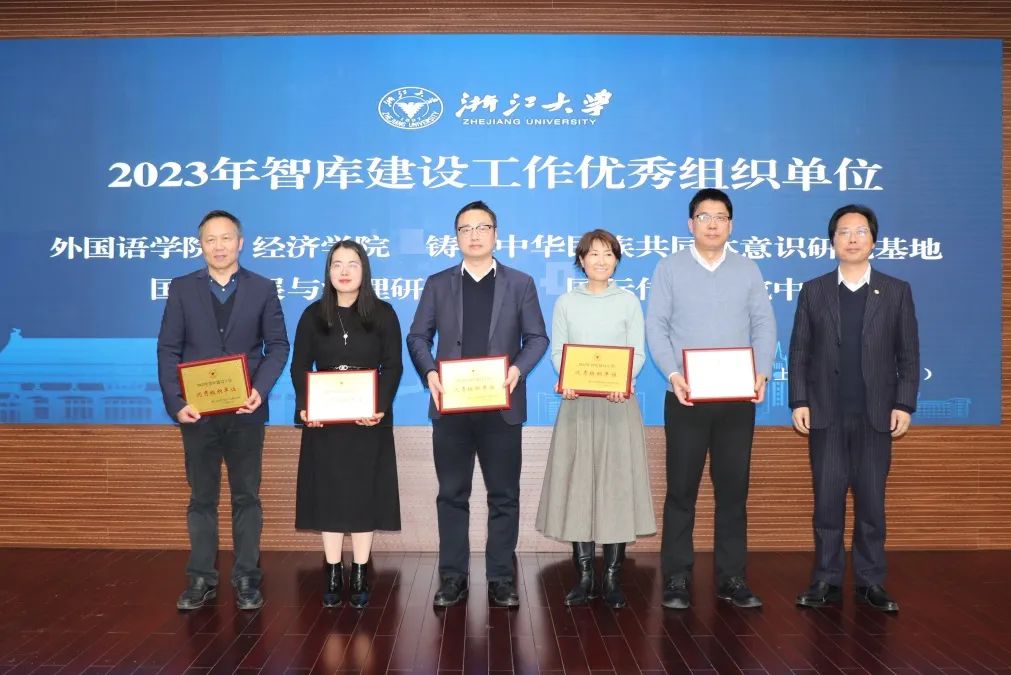 黄先海副校长向威尼斯144777欢迎您等5家单位颁发威尼斯144777欢迎您2023年度智库建设工作优秀组织单位奖奖牌,威尼斯官网方红生副院长代表威尼斯144777欢迎您上台领奖。