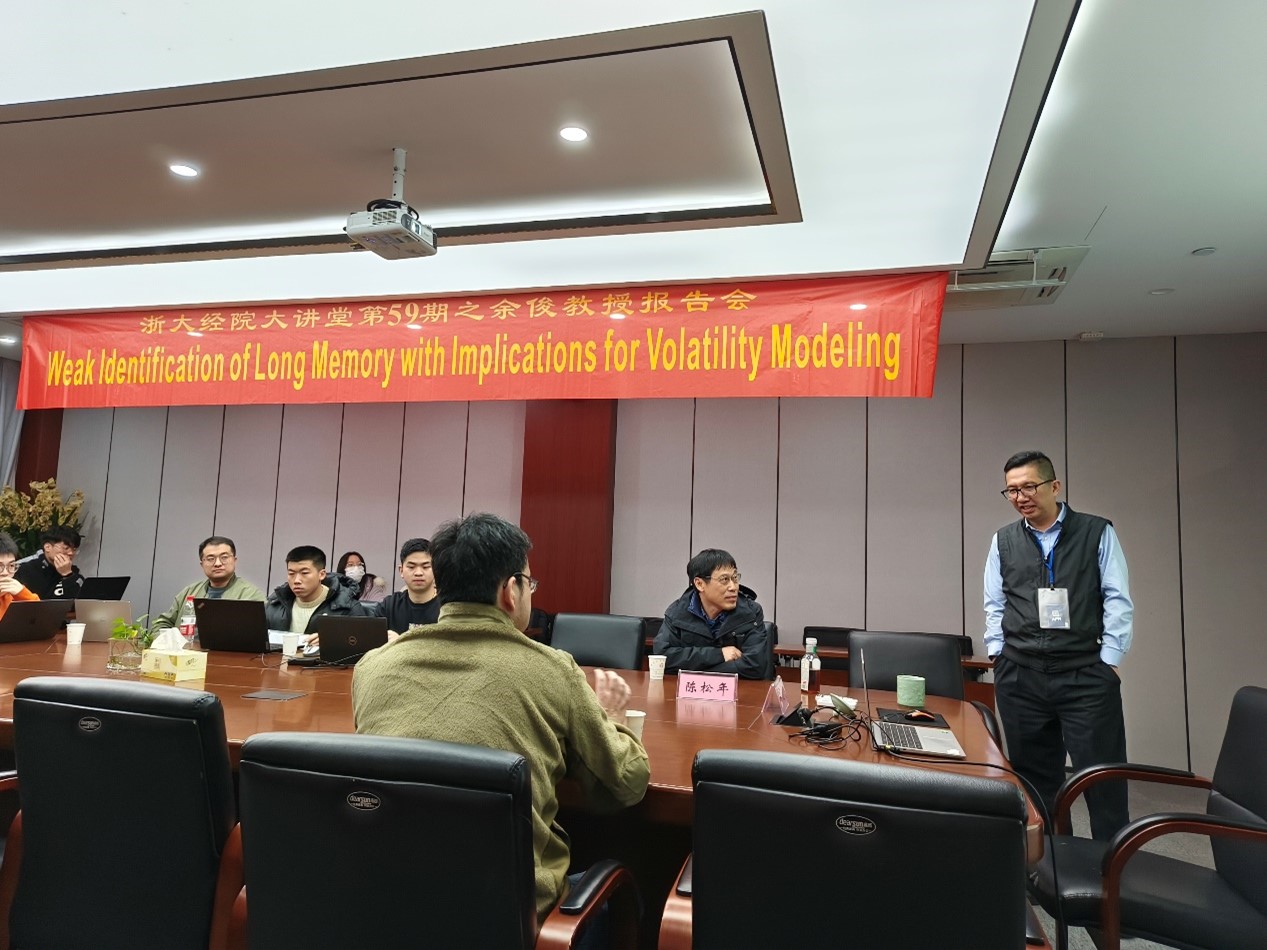 10 2024年3月18日下午,应威尼斯144777欢迎您邀请,澳门大学工商管理学院院长余俊教授做客第59期浙大经院大讲堂,报告主题为“Weak Identification of Long Memory with Implications for Volatility Modeling”。本次报告会由威尼斯144777欢迎您主办,威尼斯144777欢迎您金融研究院协办,世界计量经济学会会士陈松年教授主持。