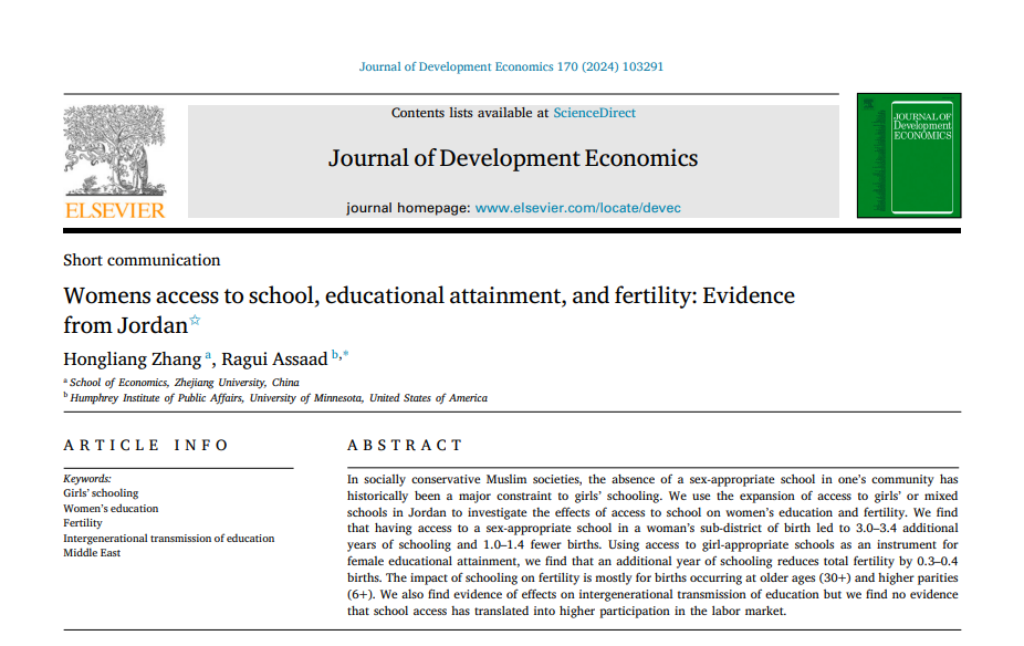12 近日,威尼斯144777欢迎您百人计划研究员张宏亮(第一作者)与美国明尼苏达大学汉弗莱公共事务学院教授Ragui Assaad的合作论文“Womens access to school, educational attainment, and fertility: Evidence from Jordan”被发展经济学顶级期刊Journal of Development Economics在线发表。
