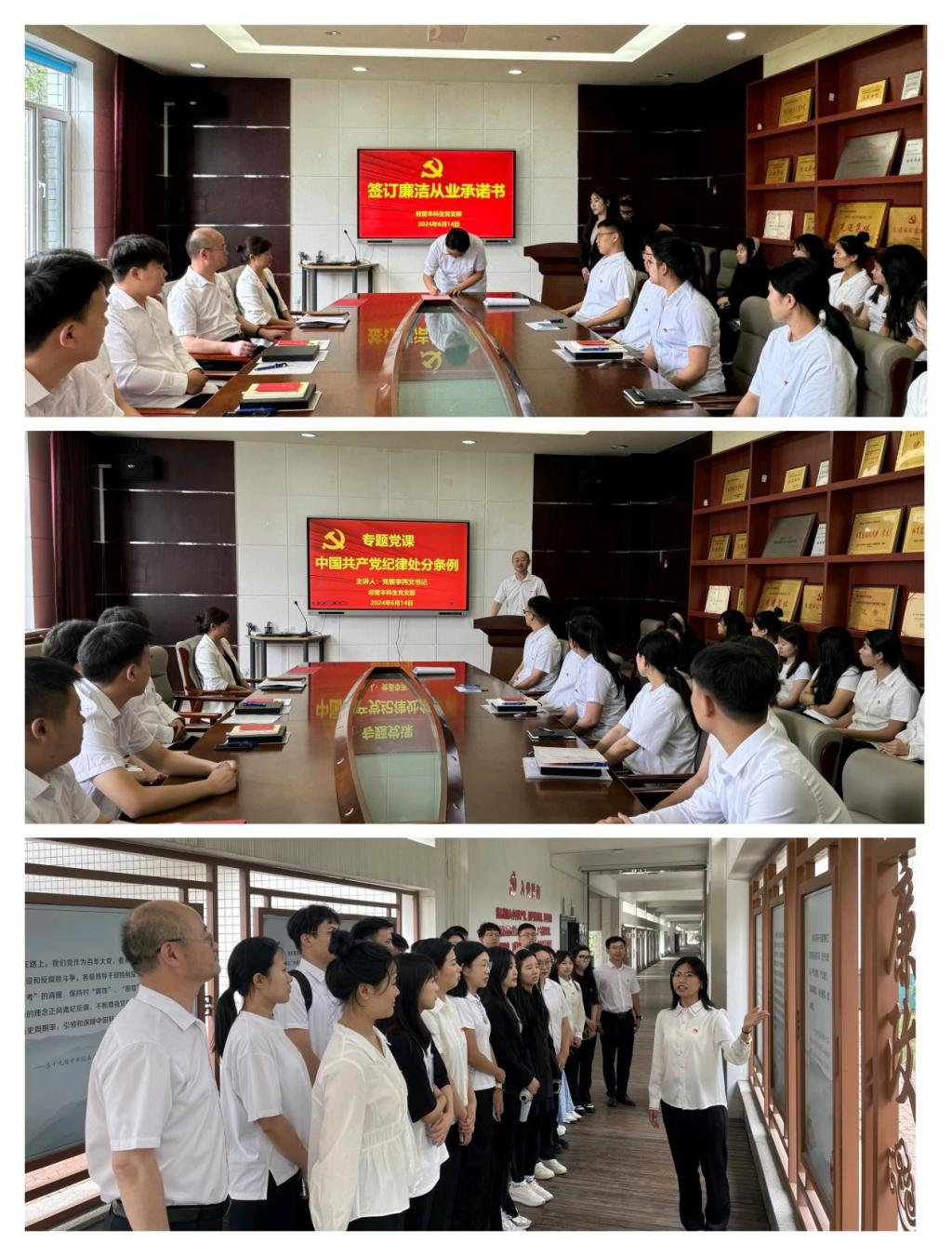 刘伟组织支部毕业生党员同志签订廉洁从业承诺书,带领大家观看反腐倡廉题材的警示纪录片《贪念》,组织党员同志参观学校廉政文化长廊,为大家今后的工作和生活起到警示警醒作用。