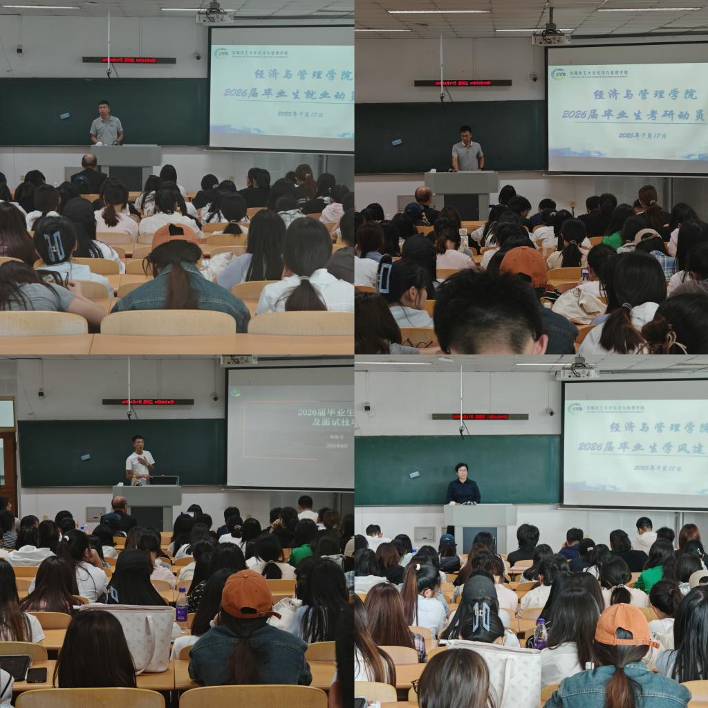 为全面加强学风建设、引导毕业年级学生明确努力方向、树立正确的就业观,9月17日,beat365正版唯一官网在通明楼338教室召开2026届毕业生年级大会。学院党委书记李丙文、院长王蓉、党委副书记关婷、工程管理教研室主任边晶梅、2025级辅导员刘伟、研究生辅导员郑烁今以及2026届全体毕业生参会。大会由2026届毕业生辅导员齐伟主持。