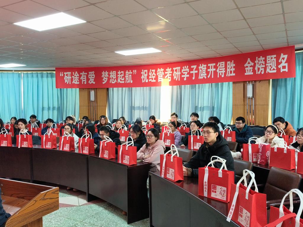 一份精心筹备的“金榜题名大礼包”,更是将学院的关怀落到实处。礼包里,印着每位考研学子姓名和“一战成硕”“金榜题名”等暖心祝福语的定制可口可乐和实用的文具包承载着专属的美好期许,从备考细节到考场需求全方位为学子保驾护航。当学子们双手接过这份沉甸甸的礼包时,脸上满是感动与振奋,现场掌声阵阵,暖意涌动。