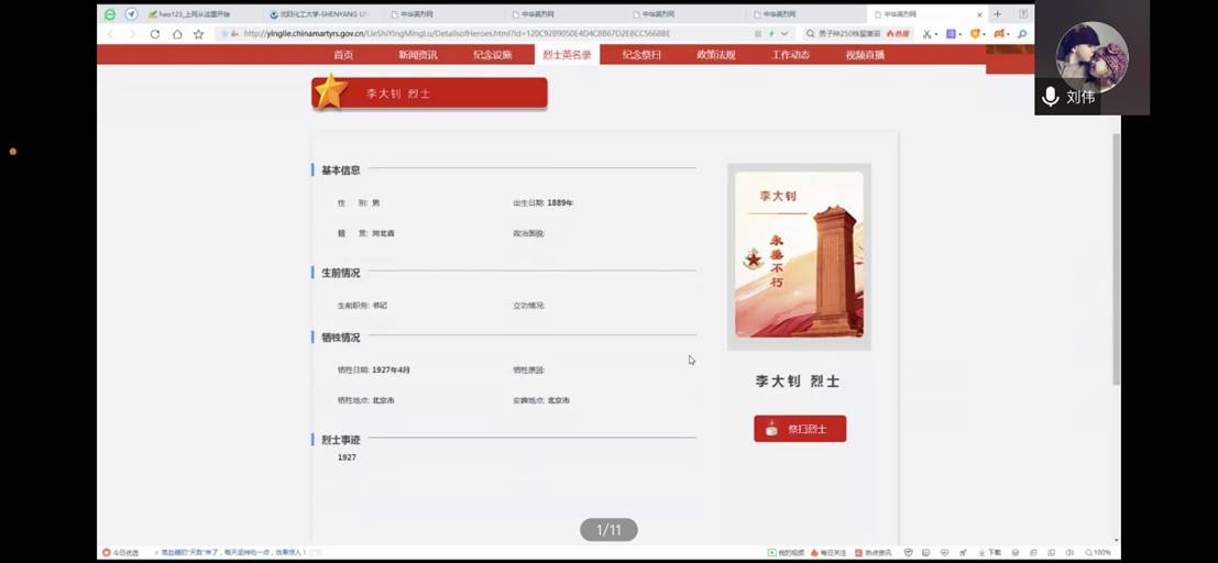 通过分享革命先烈光辉事迹,重点学习了董存瑞、李大钊、刘胡兰、杨靖宇四位英烈人物的功勋事迹,表达对革命先烈、民族英雄的哀思和怀念。同时,观看网络上缅怀英烈、弘扬英烈精神、向人民英雄纪念碑敬献花篮的直播视频,积极引导青年学生厚植爱党、爱国、爱社会主义的深厚情感。