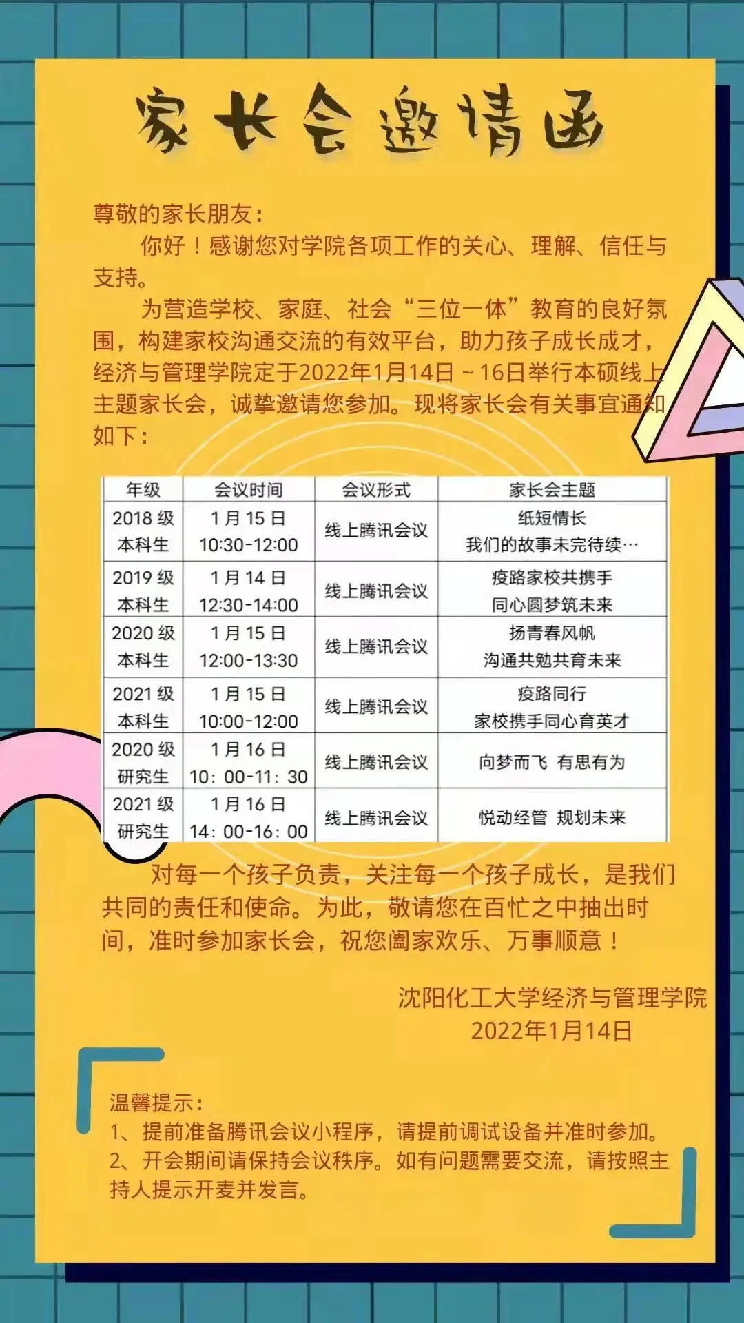 为进一步加强家校沟通,促进家校合作,2022年1月14日至16日,beat365正版唯一官网线上主题家长会正式开启,全国各地的1460个家庭,通过互联网齐聚“云”端。本次家长会由学院统一部署,制定线上家长会方案,突出年级和阶段特点,精心策划会议内容。