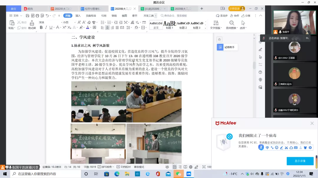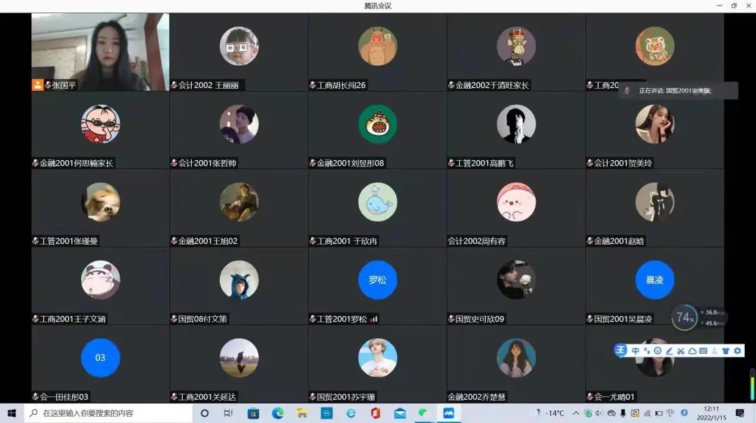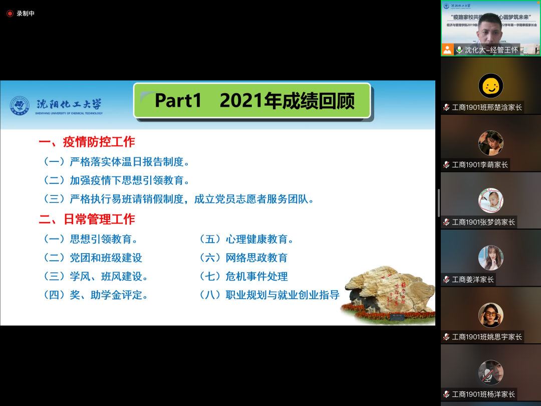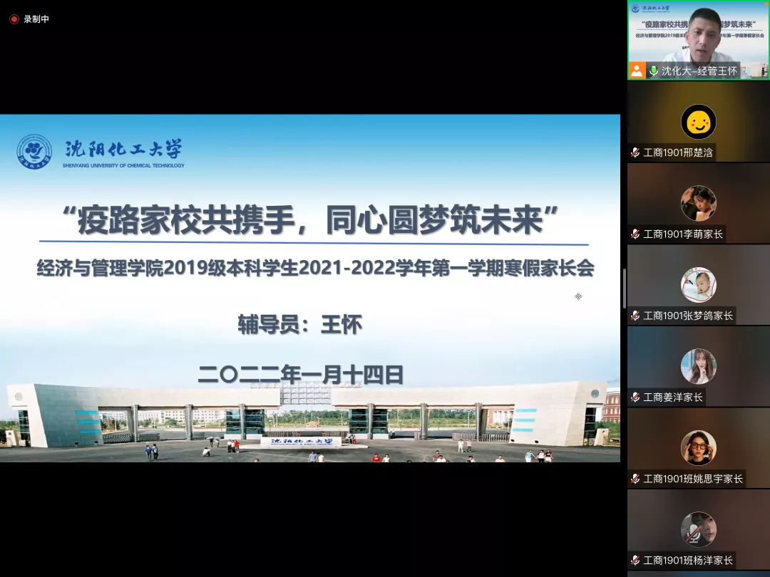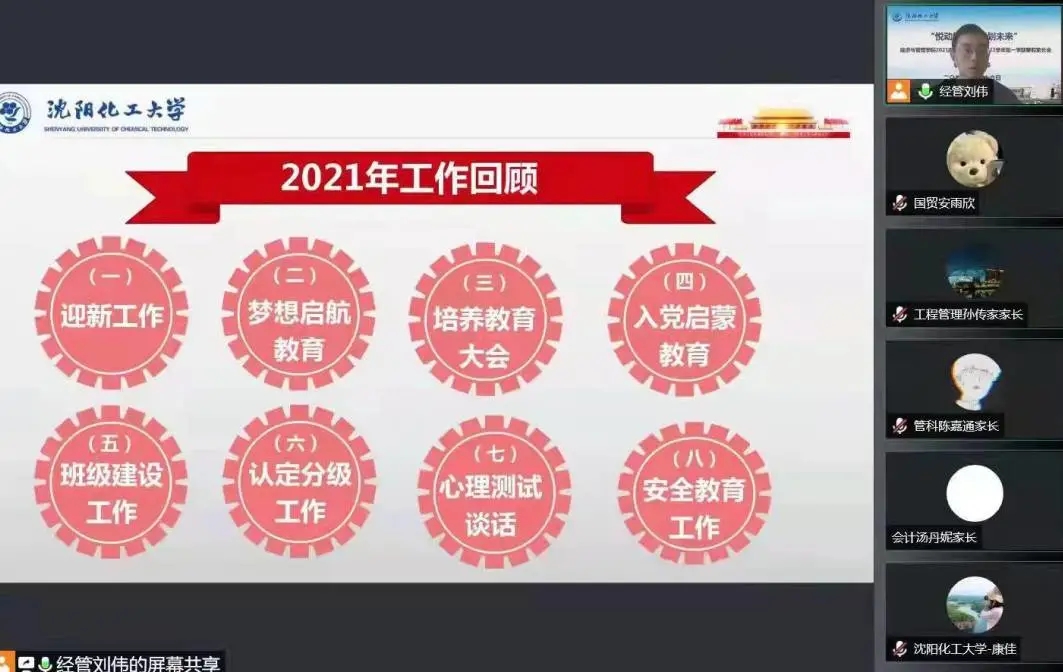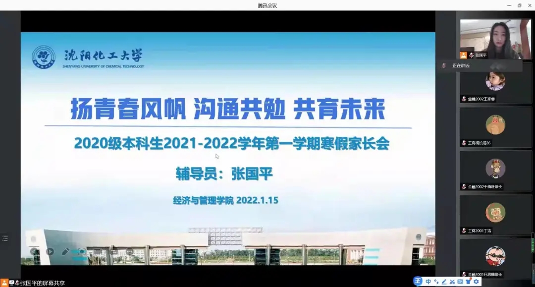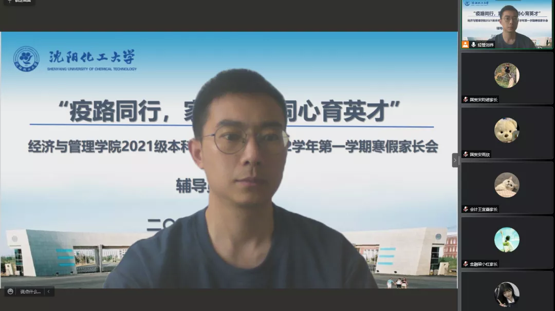 2021级新生入学刚满一学期,再次与家长网络相聚,倍感亲切。辅导员刘伟老师首先为家长介绍了2021级学生在校学习、生活情况,分享了孩子们的成长瞬间,着重强调疫情防护和假期安全。他动员学生,寒假期间,要积极参加家乡的社会实践活动,积极参加体育锻炼,注意防盗防骗等。会后,家长们纷纷在家长群内自发地分享对学校、学院、老师的感激之言。