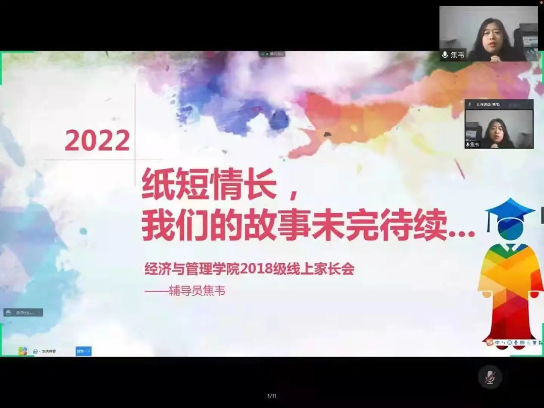 为更好发挥家校协同育人作用,帮助毕业生及家长全面了解就业政策、就业现状及职业发展等问题,毕业班辅导员焦韦老师和全体毕业生家长相聚线上。焦老师从学生就业、考研考公、工作实习、招聘就业、职业选择等多方面进行了分析,希望家长配合学校帮助学生树立良好的就业意识,形成就业合力,共同促进学生高质量就业,她就假期疫情防控、毕业环节安排等工作进行详细解读,针对部分学生因为学业压力、就业压力等产生心理困惑,提示家长要感知孩子的情绪状态,梳理情绪难点,在关键点上及时清理孩子的情绪负能量,帮助孩子应对压力,遇到问题可以向学校线上心理咨询服务寻求帮助。她希望22届全体毕业生,找准定位,仰望星空、脚踏实地,为四年大学生涯画上圆满的句号。