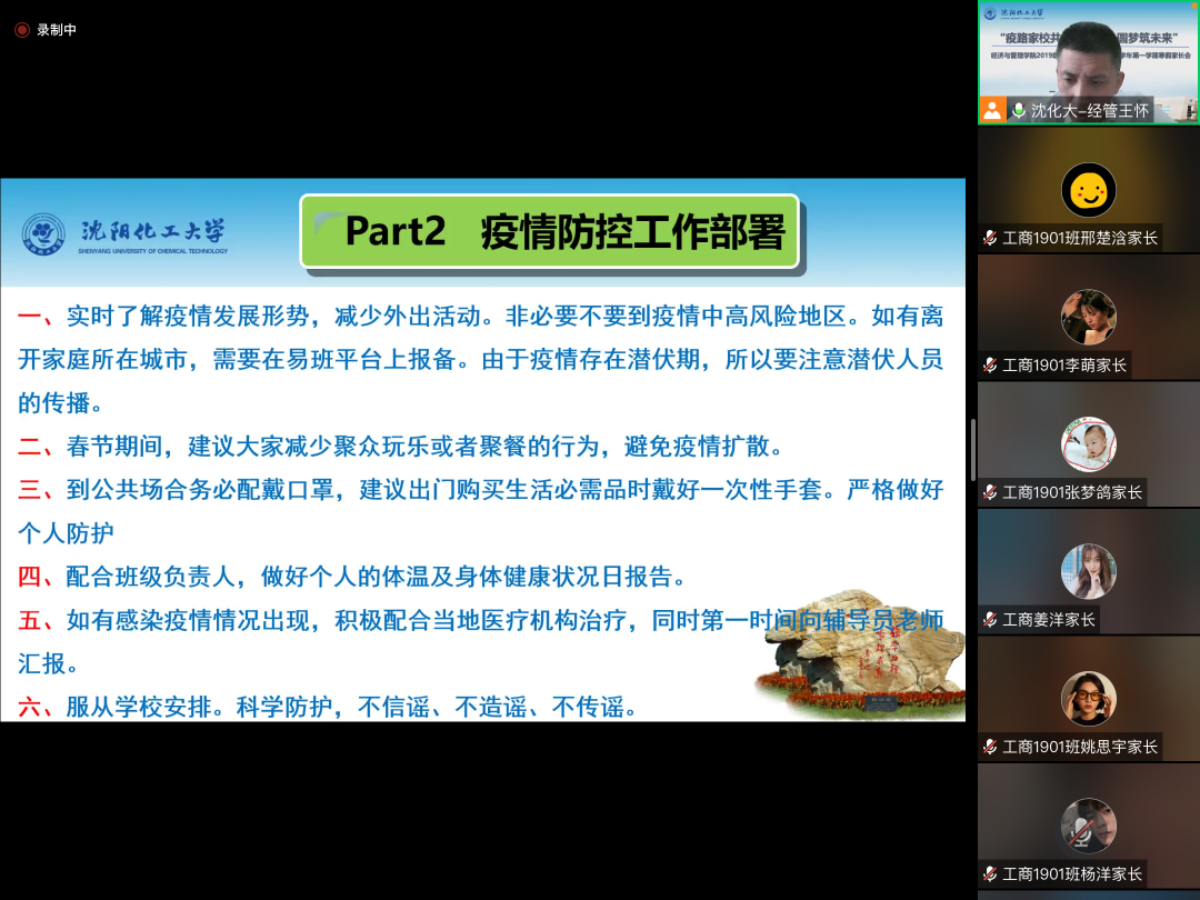 1月14日中午,2019级本科的218位学生家长准时相聚云端,辅导员王怀老师围绕辅导员工作九大职能,带领家长共同回顾在思想引领、党团和班级建设、学风建设、奖助学金评定、心理健康教育、网络思政教育、危机事件处理及职业规划与就业指导等方面取得成绩。王老师还以生动的案例为切入点,从细处着手,围绕疫情防控、交通安全、防骗教育、假期就医、五育并举、心理健康等方面内容进行具体讲解。家长会结束后,家长情不自禁地在班级微信群里发表感言,一字字、一句句、一段段地对王老师的辛勤付出表示感谢。